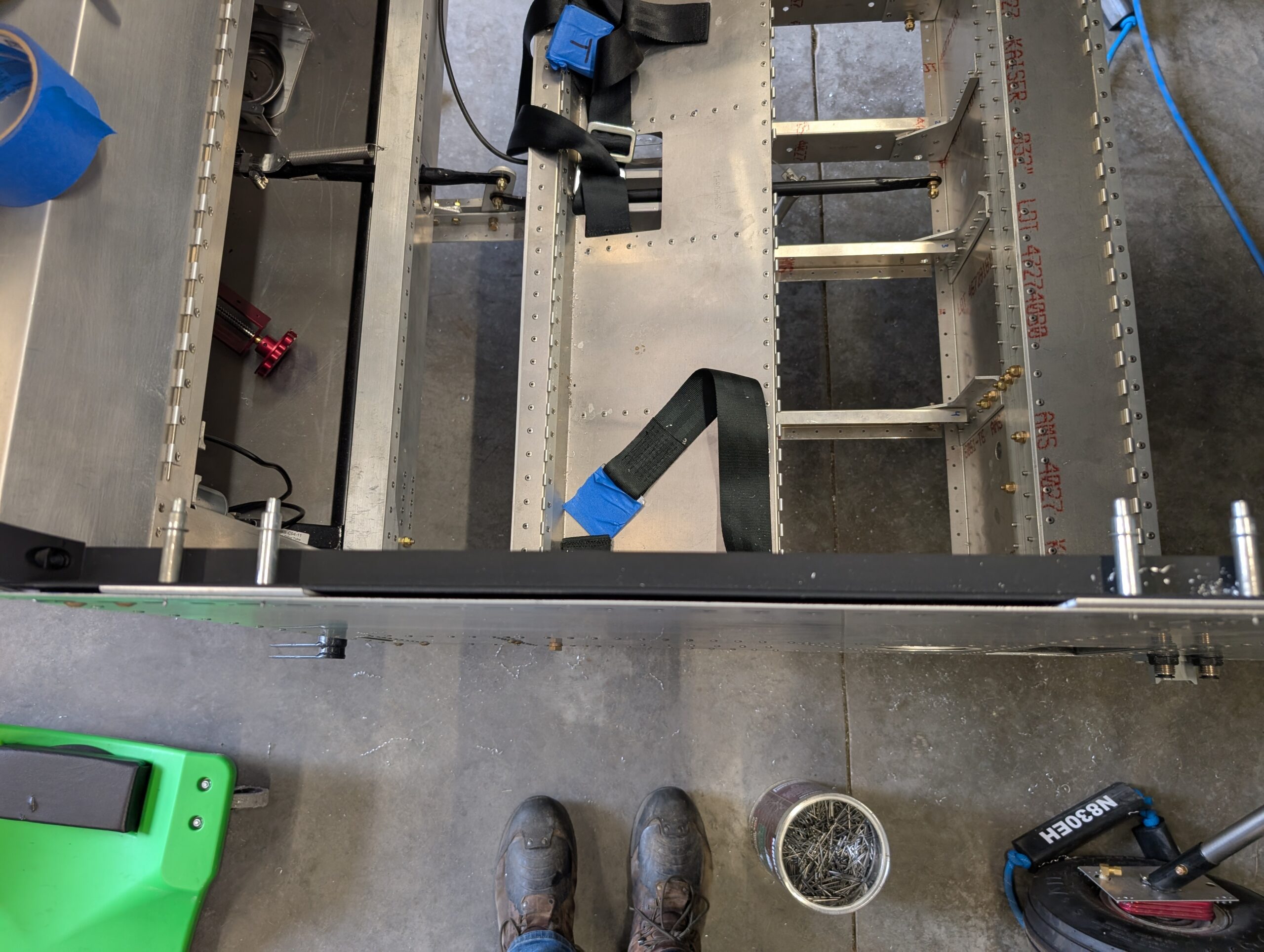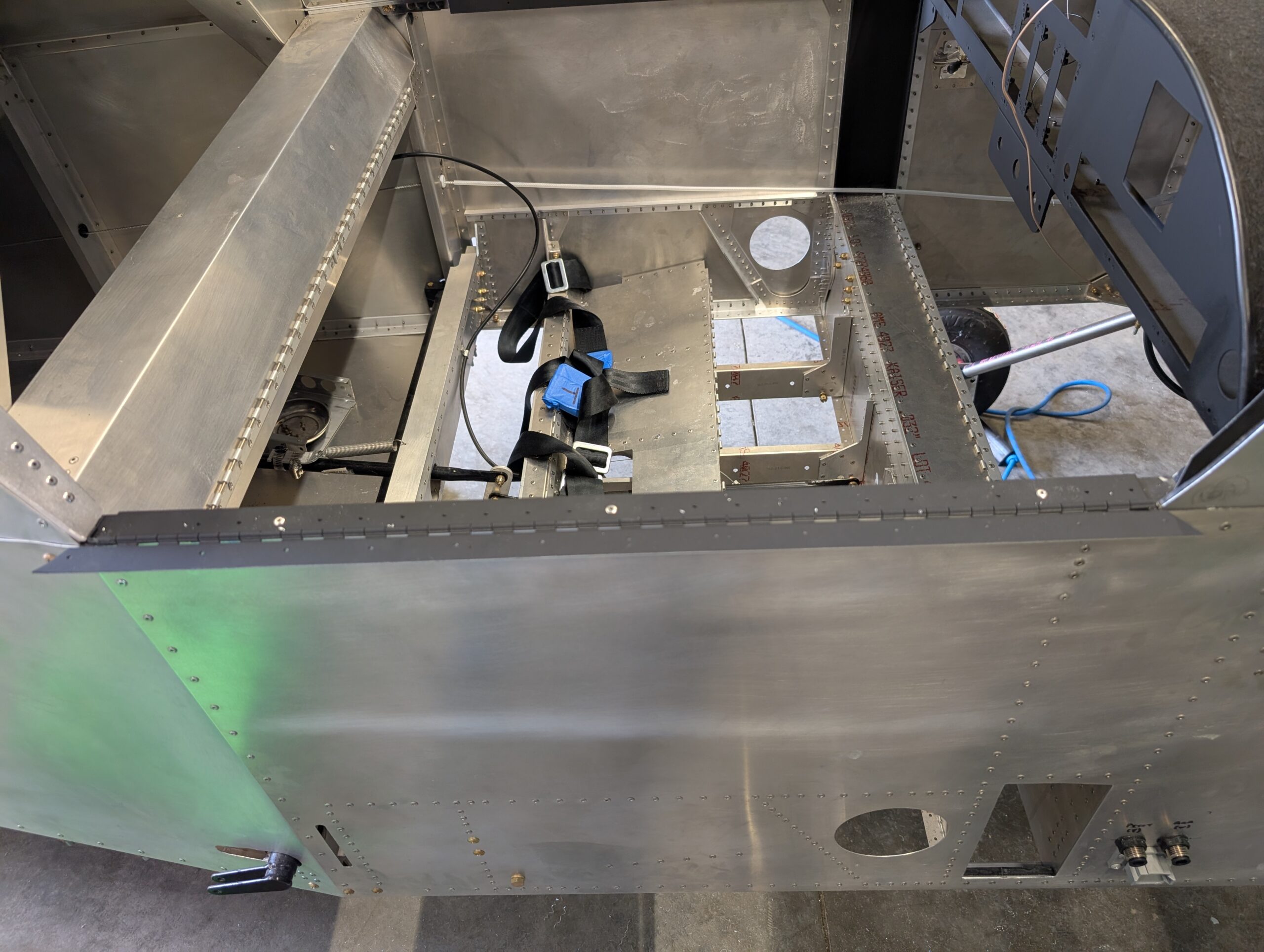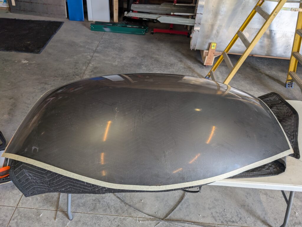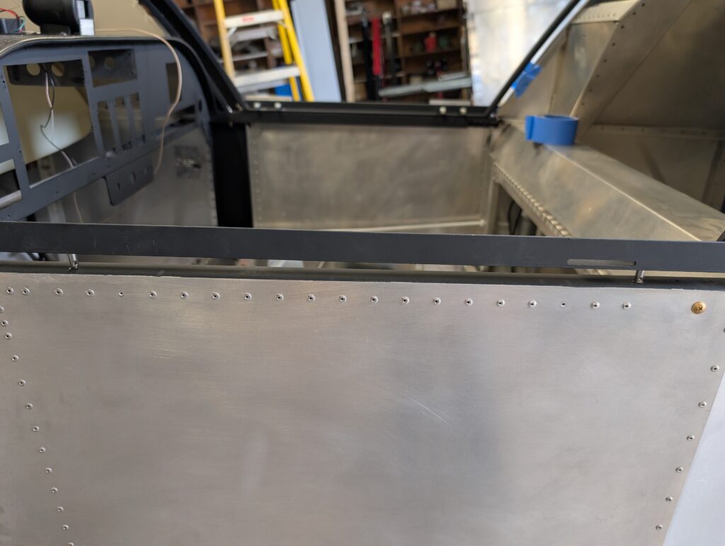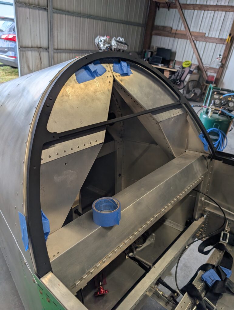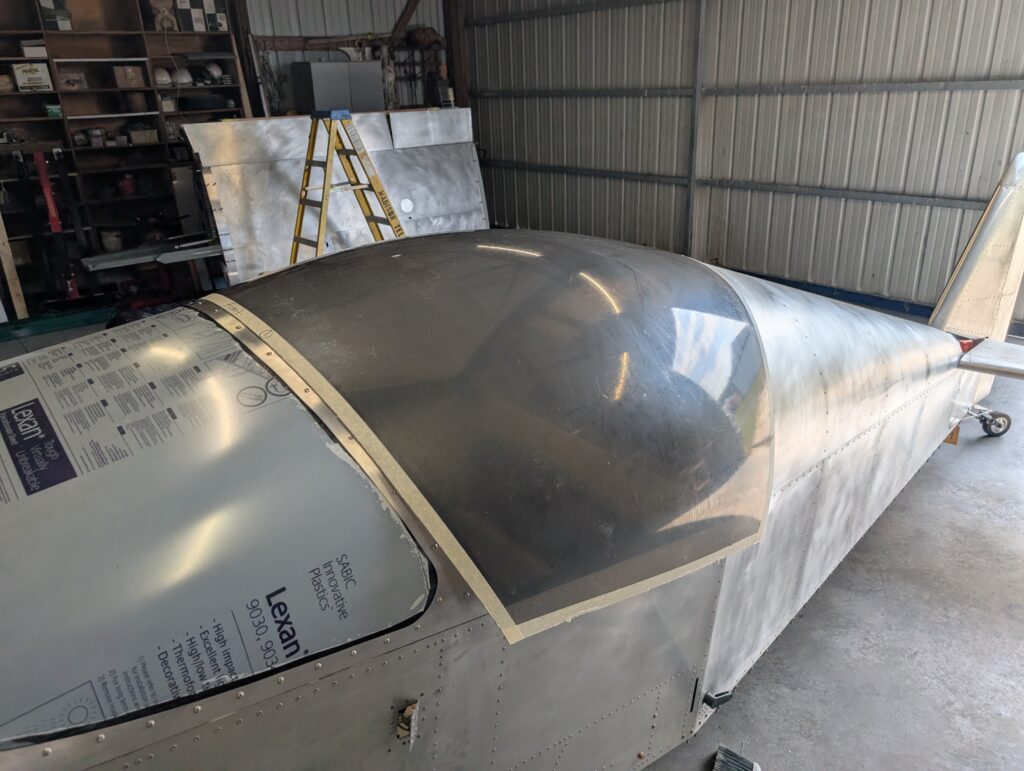 Began assembling canopy frame to fuselage by locating canopy frame hinge on RH longeron. Since clecoes would impede placing the canopy frame on the hinge, installed three rivets in the canopy frame hinge to make it easier to remove (if needed later on). Placed canopy frame onto fuselage and aligned it 1/2″ from the turtle deck with 3D printed spacer blocks. Clamped canopy frame into place then made 1/8″ spacers to simulate the canopy thickness between the canopy frame and hinge. Pilot drilled spacers then clecoed together to mock up final canopy frame location. On LH side, marked location of alignment pins on the LH longeron and updrilled holes to “loose” 1/4″. Installed canopy alignment pins and tested operation of canopy frame; seems to function well. Trimmed canopy to factory marked trim lines and mocked up onto fuselage.