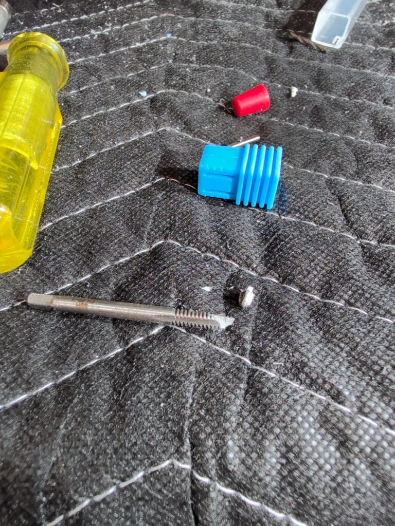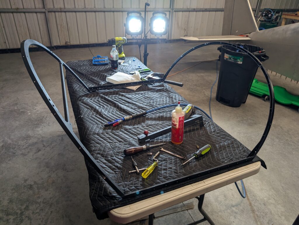 Spent most of the time getting the broken off tap out of the canopy frame. Tried to remove it with cutting fluid, heat, and punches but would not budge. Ended up purchasing two solid carbide drill bits and slowly drilling out the tap. Boogered up the hole a bit in the process but the canopy frame should still be useable; will plan on using longer 6-32 screw and small nut on the inside. Finished tapping the rest of the canopy frame holes but using cutting fluid. Will clean heavily before attaching the canopy.