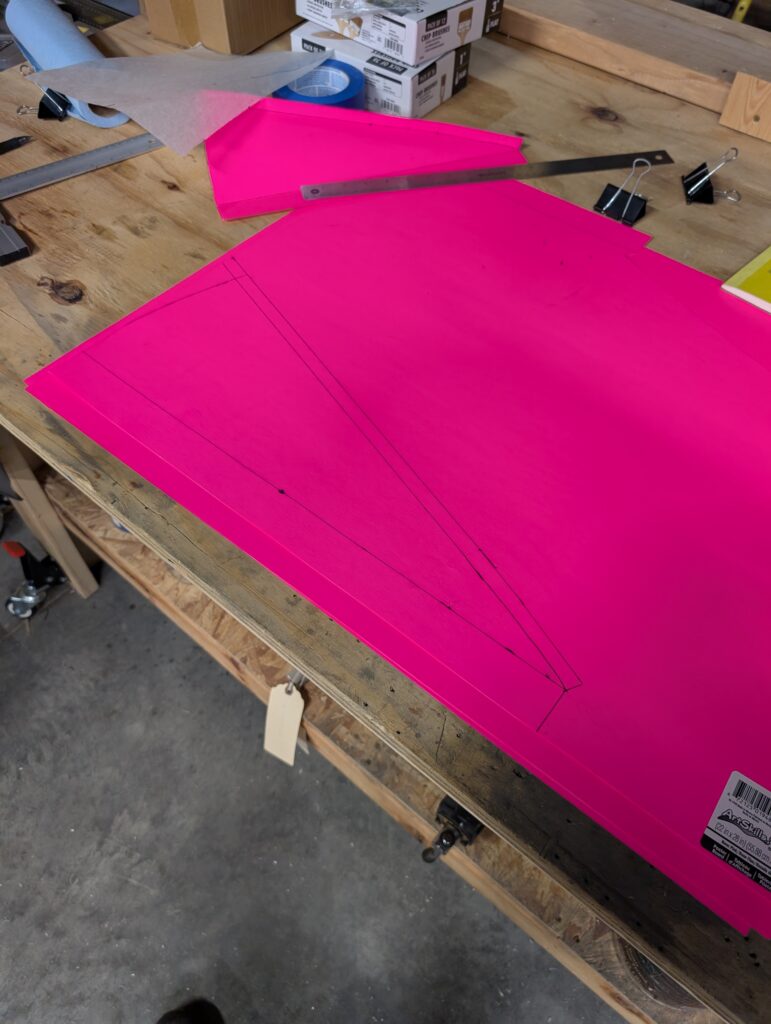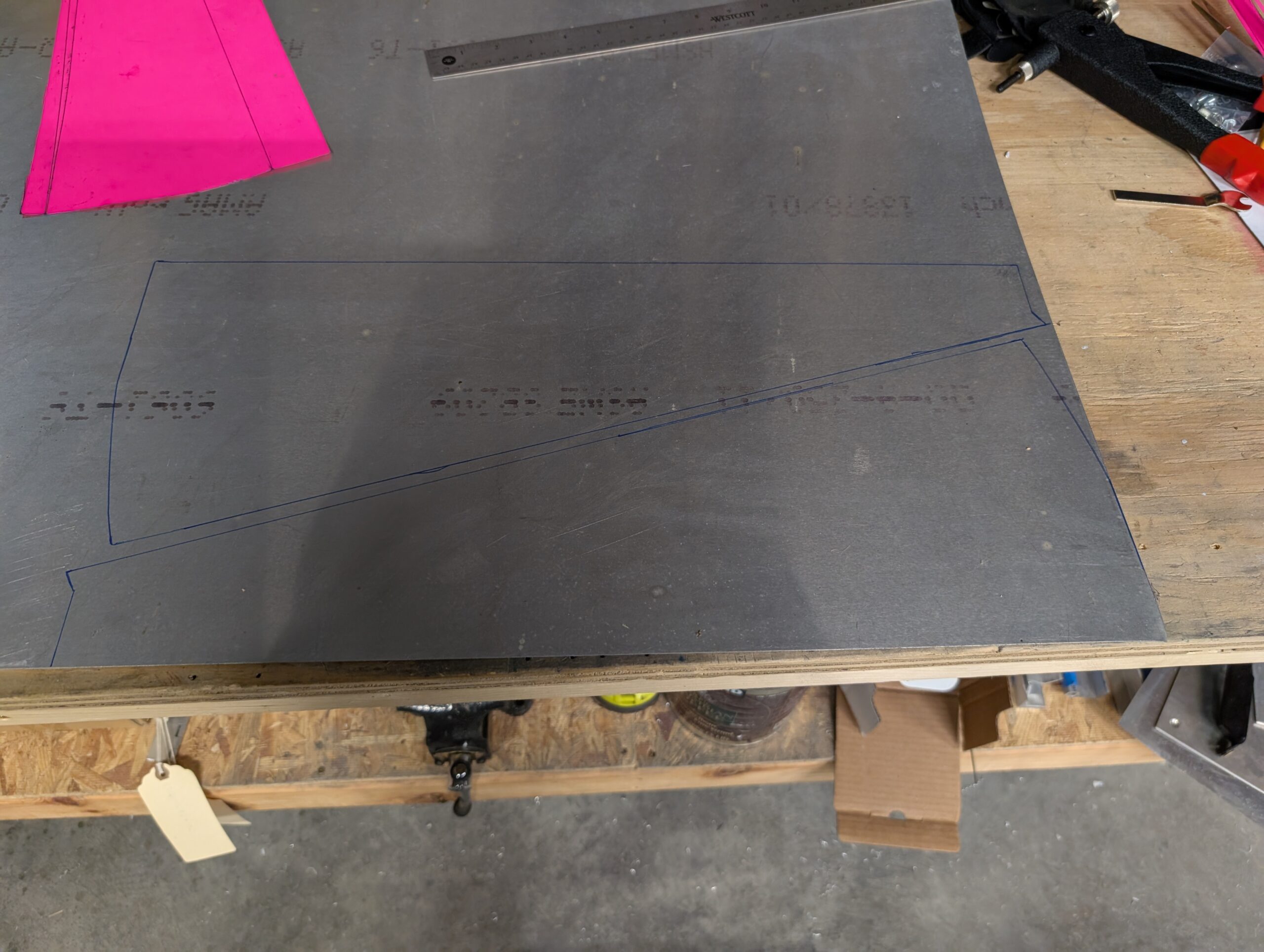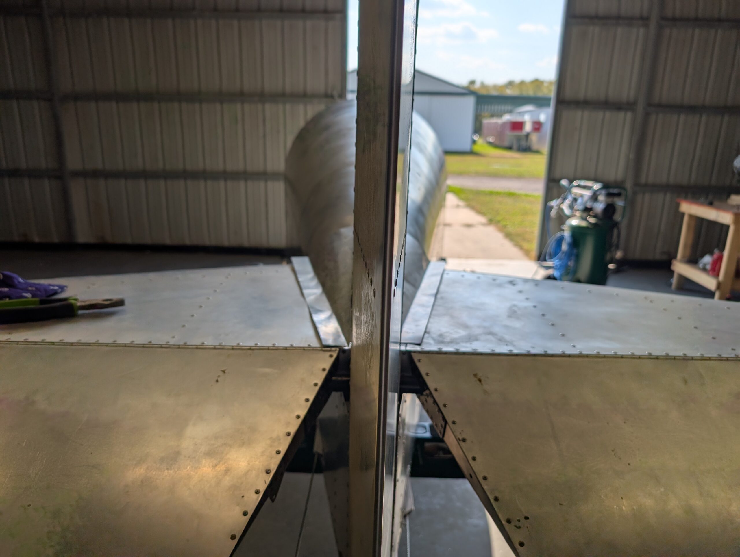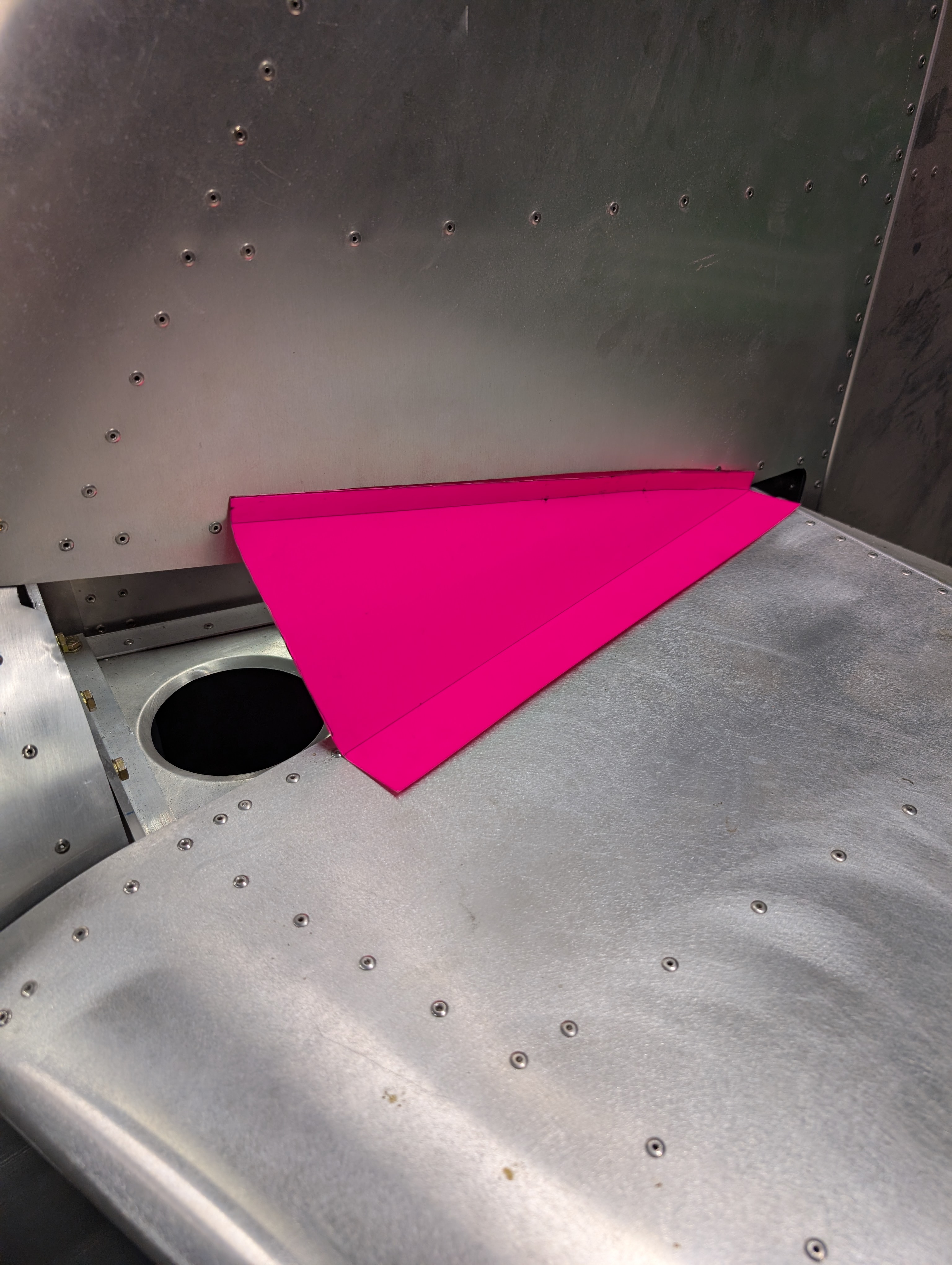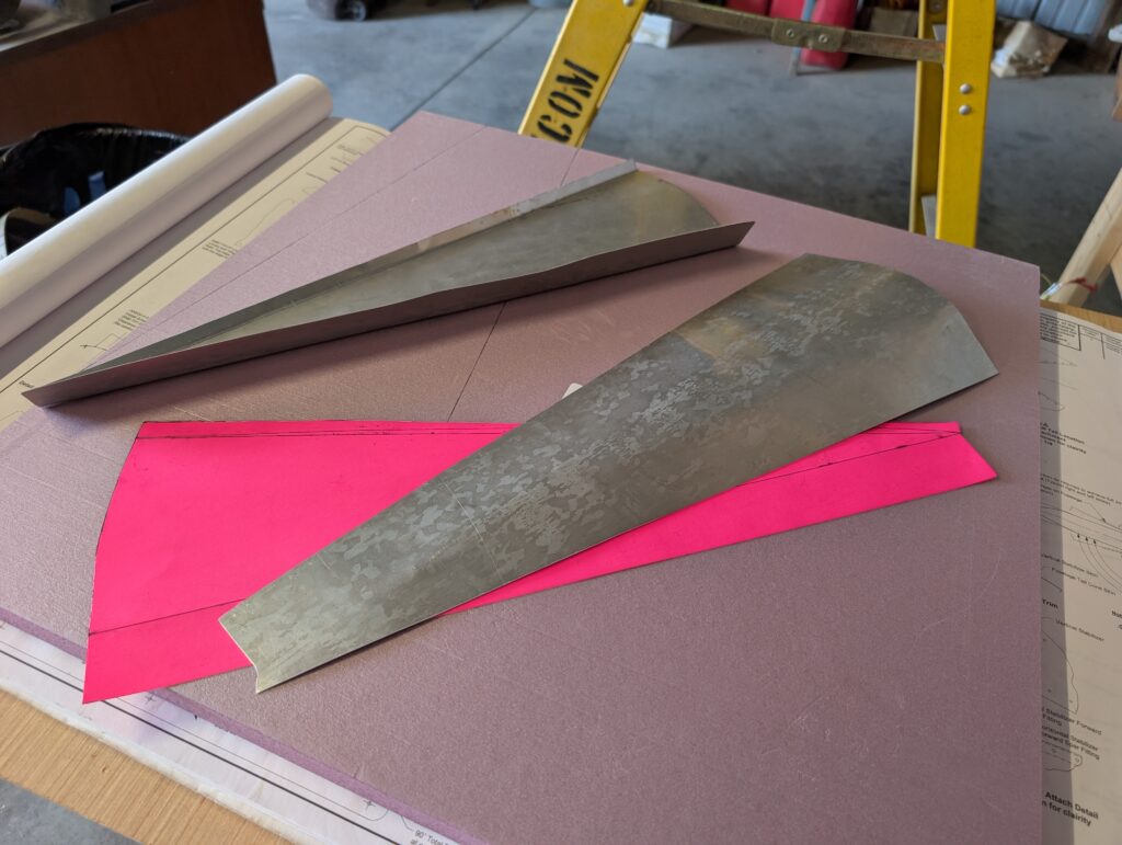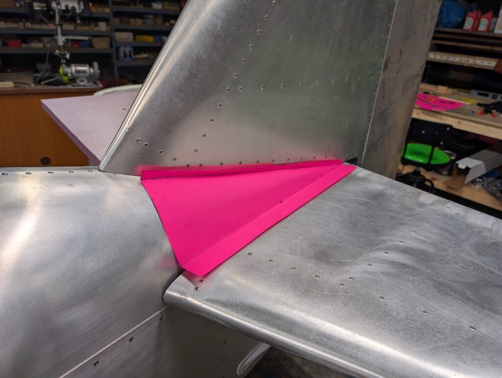 Began working on the tail fairing panels by cutting out template from plans on poster paper and mocking it up on the fuselage. Because the tail skin was installed upside down and needed extra trimming, will need to modify plans template. Expanded template forward and outboard to better match profile of upper fuselage and cover extra gap on horizontal stabilizer. After making the template out of poster board, transferred the pattern to .025 aluminum sheet and began to bend fairings into place. Will need some more work after annealing to better fit the gap.