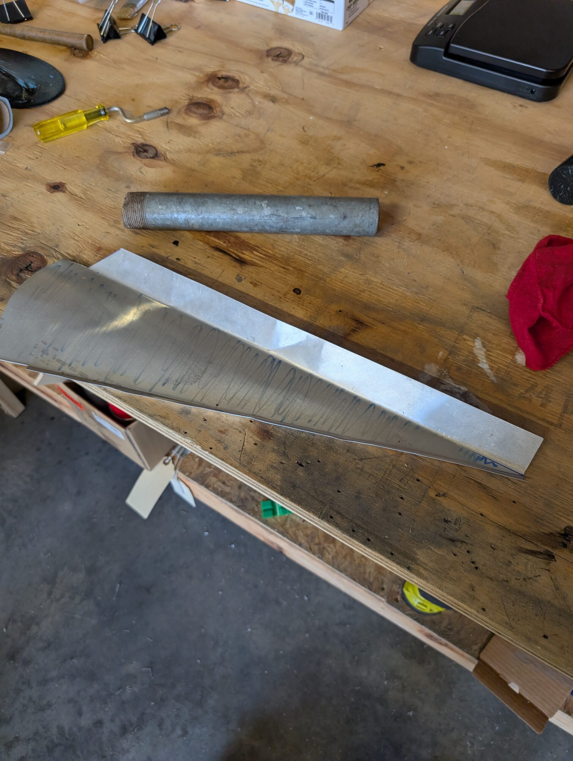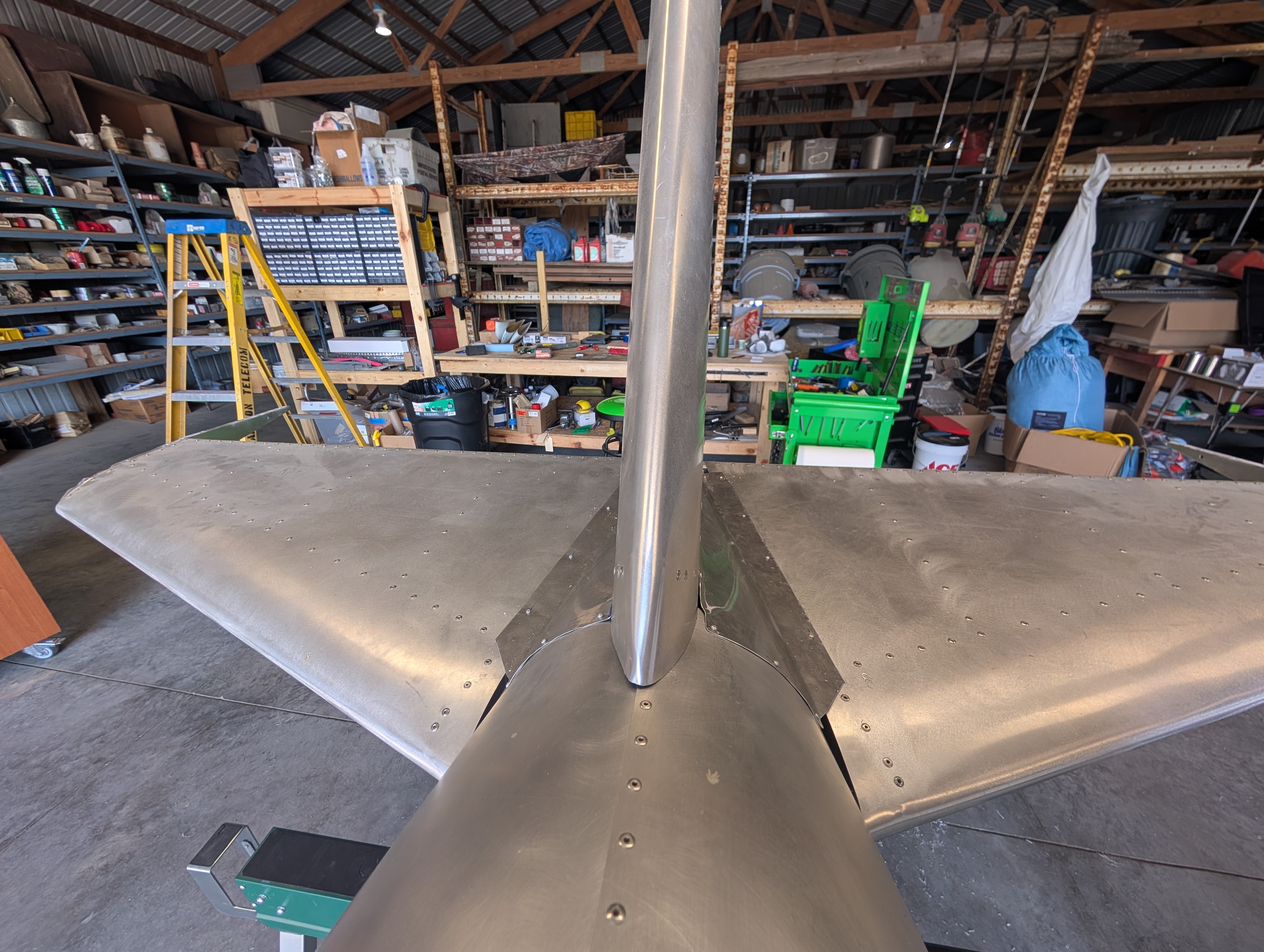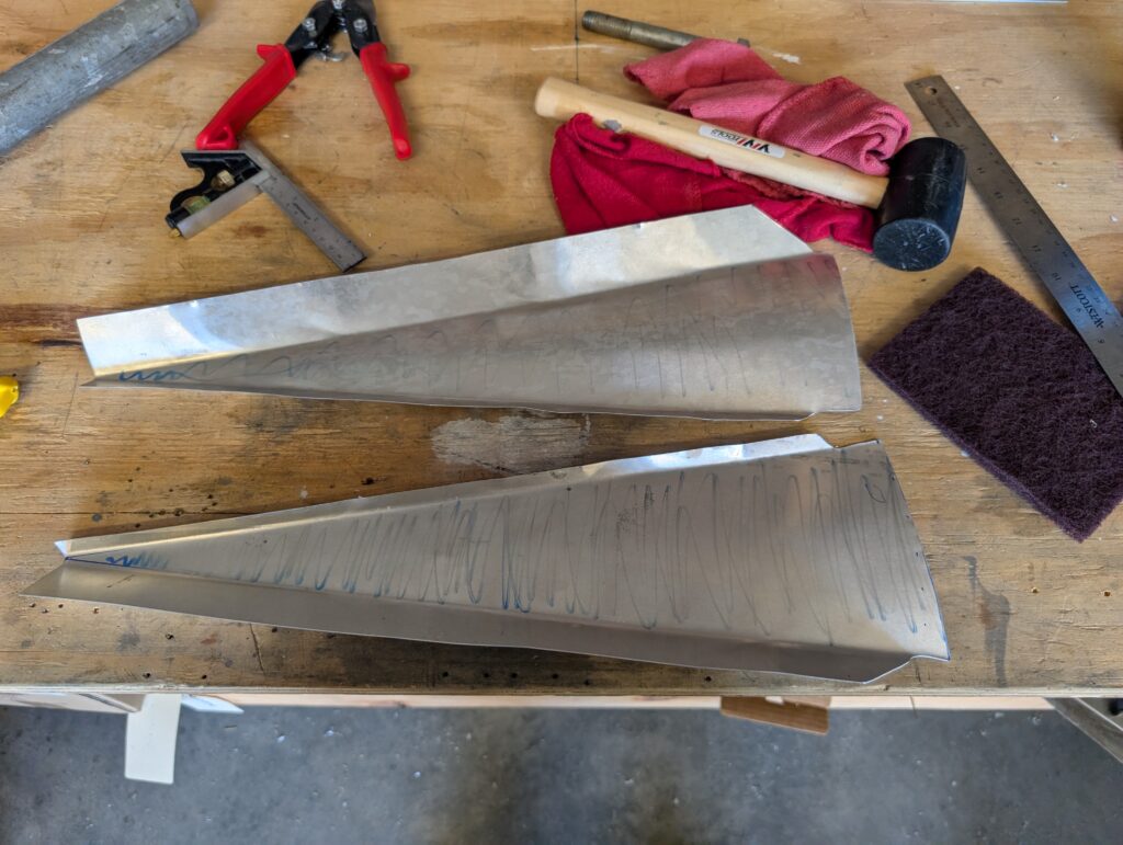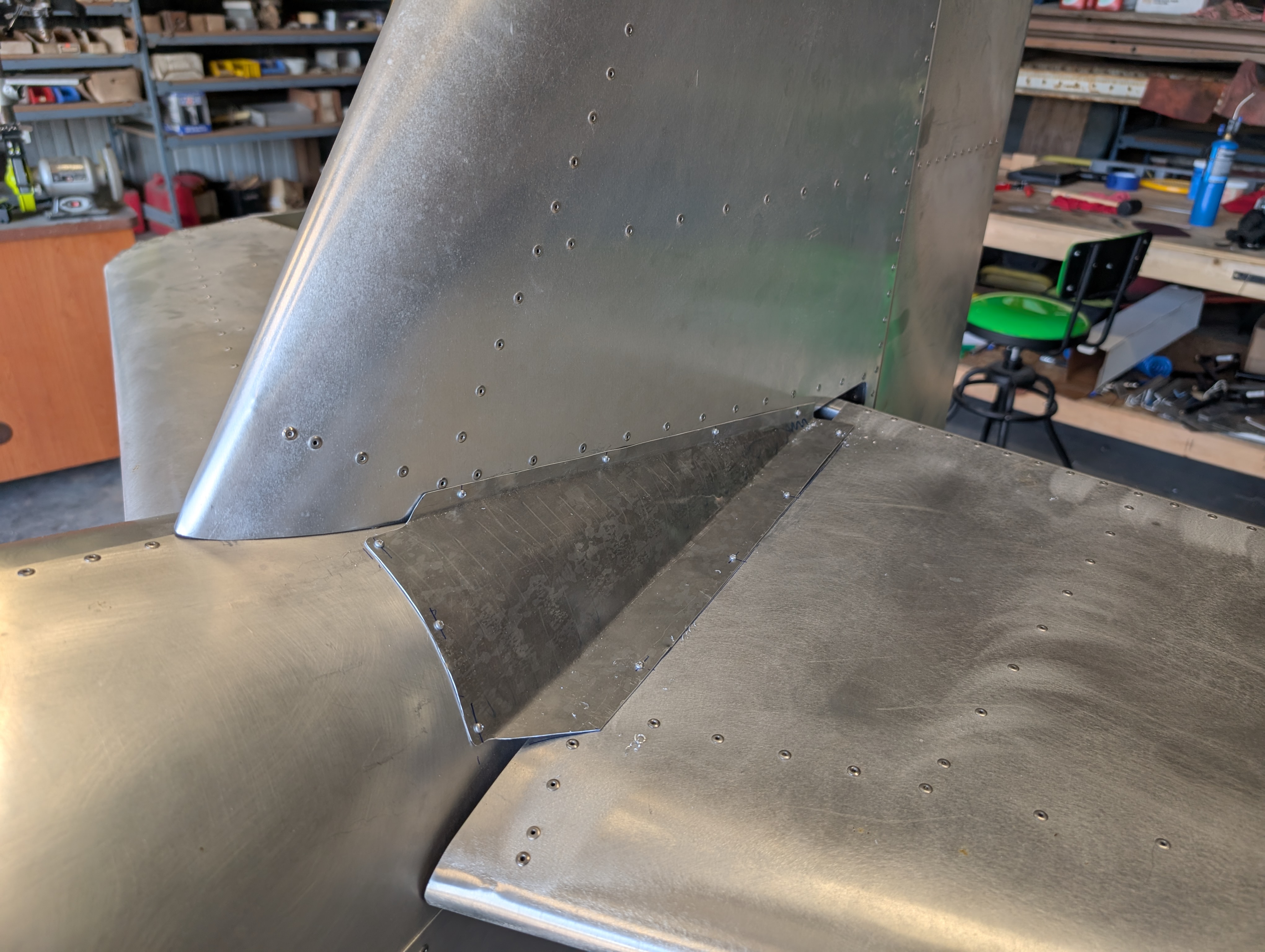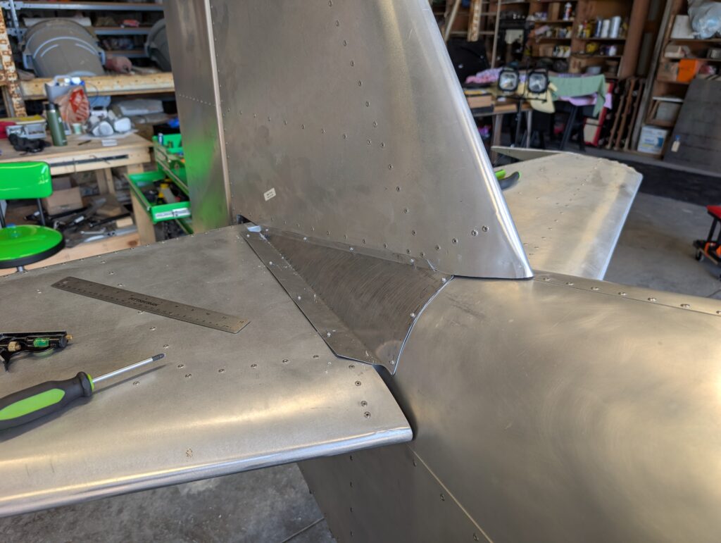 Continued to work on tail fairing panels by annealing panels via sharpie method; scribbled sharpie on the panels then heated them via torch until sharpie marks began to disappear. After annealing, worked panels over a couple scrap pieces of pipe to work curve into the panels; this method worked much better than expected. After shaping the panels into an approximate bend, laid them onto the fuselage and tweaked the flanges slightly to get them to sit flush. Once panels were close, pilot drilled panels and transferred holes into vertical and horizontal stabilizers with 5/64″ drill bit for sheet metal screws. Verified final fit then removed panels to better trim front flange and updrill holes in panel to 1/8″. Will wait to reattach panels once everything is painted.
