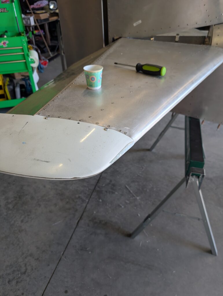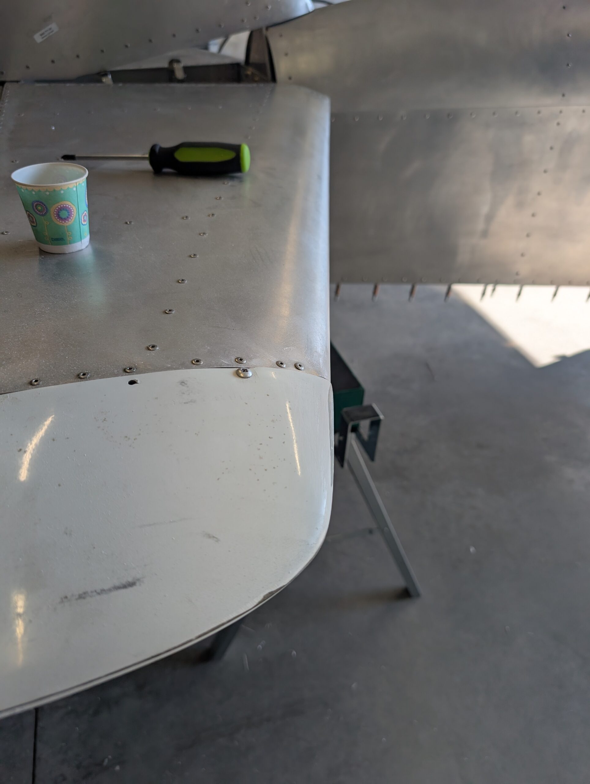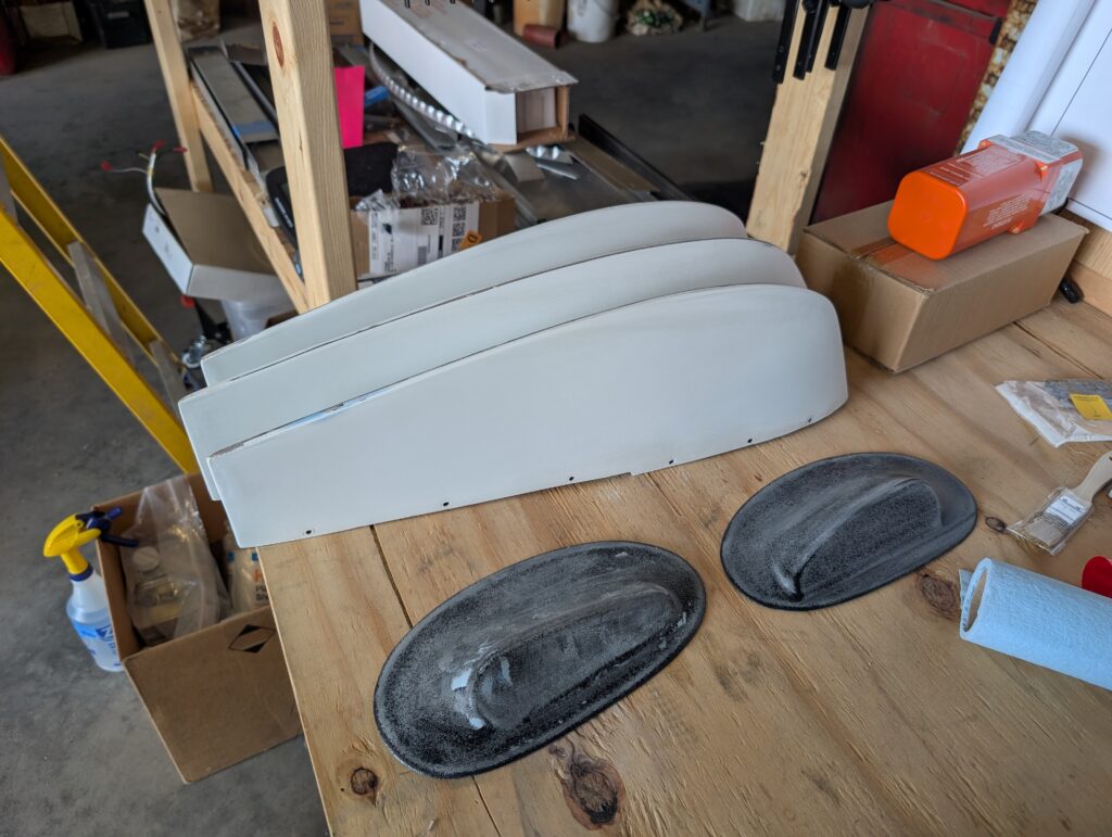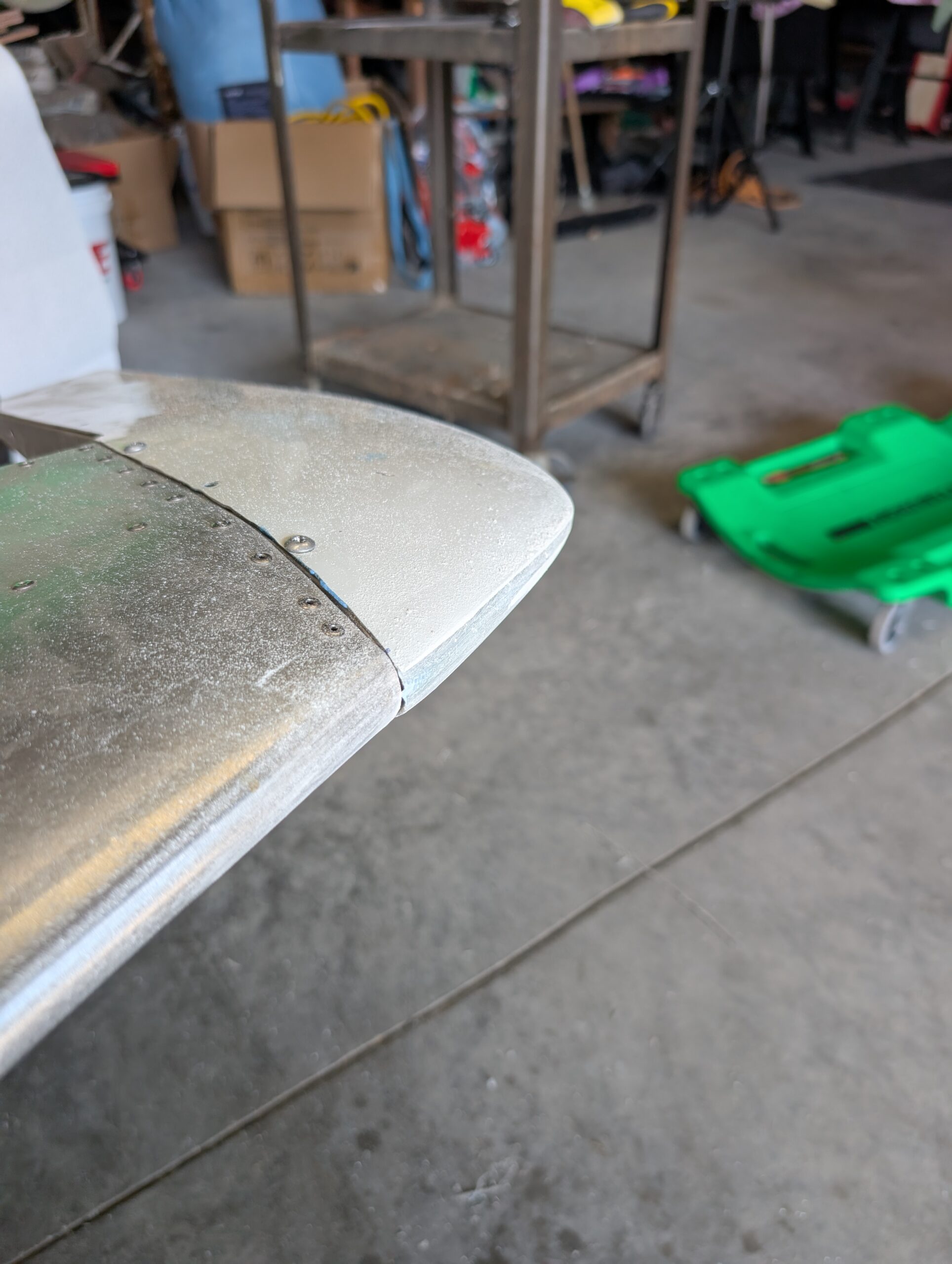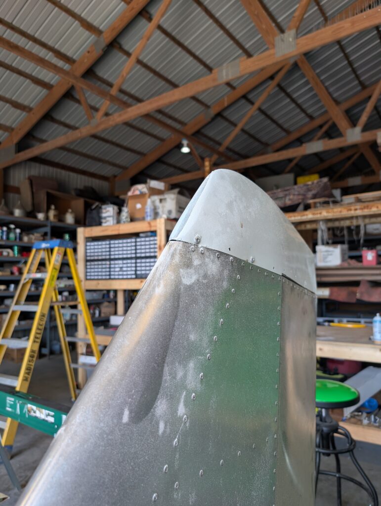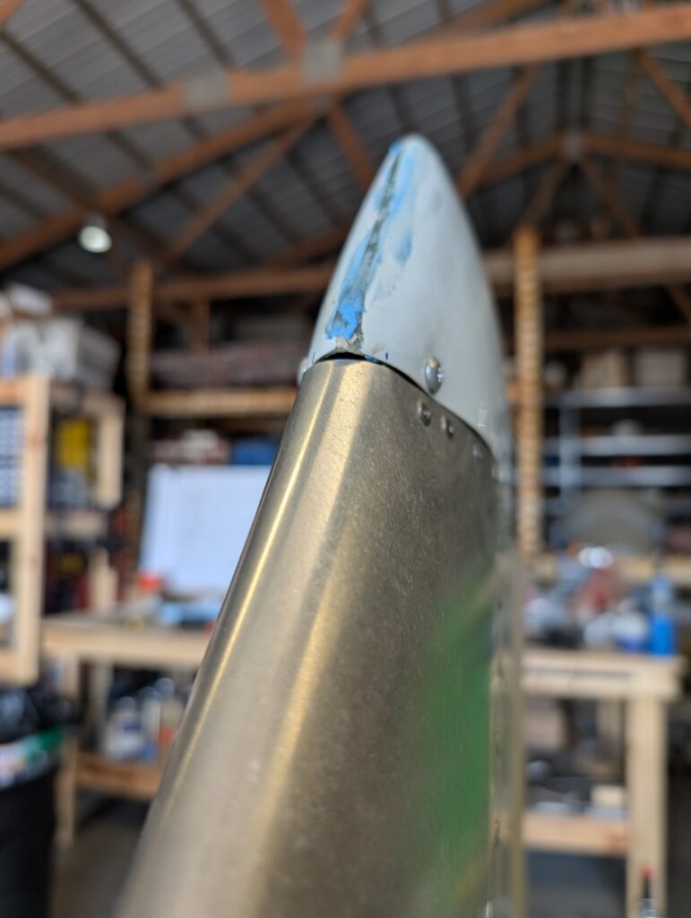 Started process of final shaping of the tail tip fairings by mounting fairings back onto the tail and contouring leading edge with 80 grit sandpaper. Luckily put enough SuperFil into each cavity that there was enough material to work with. After tips were shaped, removed them and sanded entire tip with 120 grit then 240 grit sandpaper to remove part of the gel coat and get them ready for paint. Also sanded tip light fairing to prep them for paint as well.