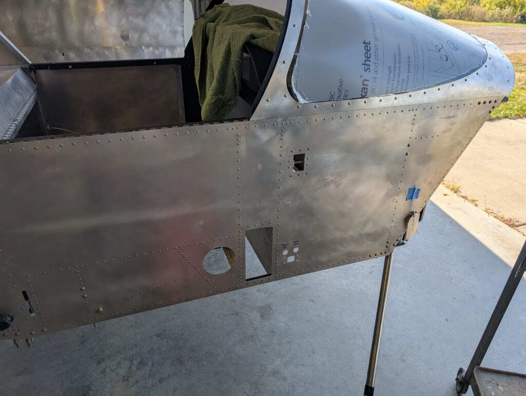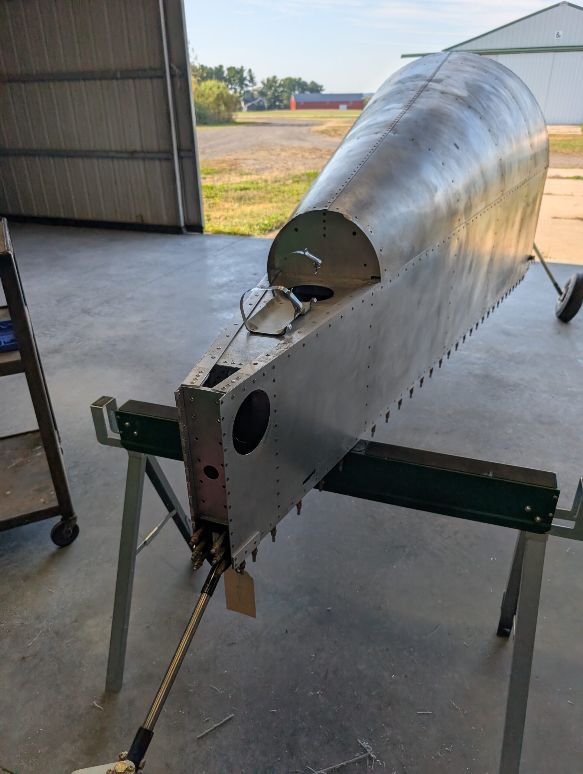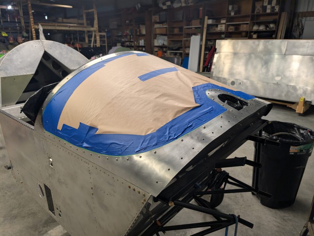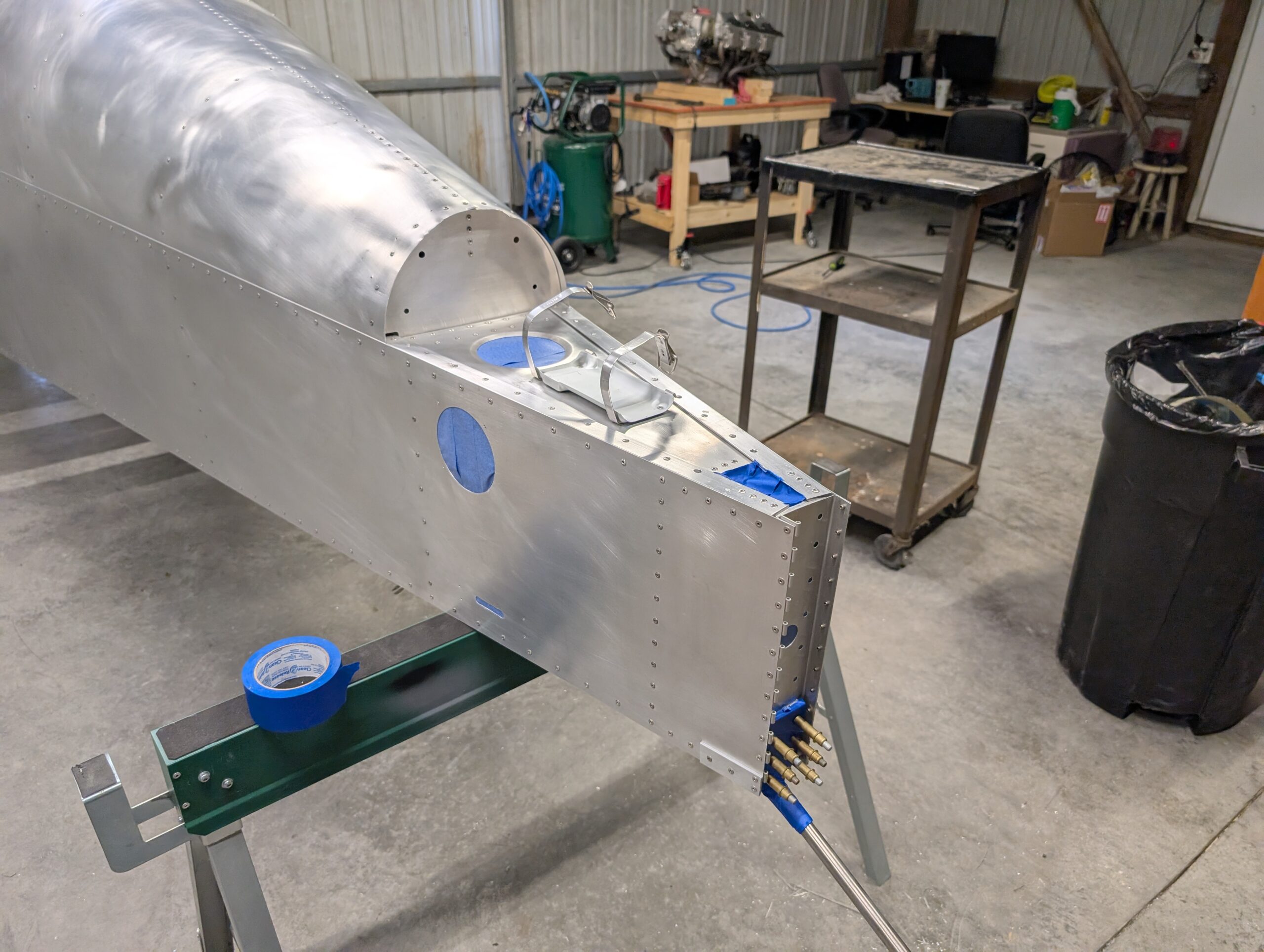 Began prepping fuselage for paint by removing tail components and setting off to the side. Removed inspection covers, pitot plumbing fittings, wing connectors, and vents from fuselage as well. Taped off edges of windshield with nice striping tape, then finished covering windshield with kraft paper and blue painters tape along with canopy sill on aft side of windshield bow. Taped off interior fuselage parts and removed aft fuselage floor for better access. Scotchbrited entire fuselage and cleaned with acetone. Began taping up openings in fuselage with painters tape.