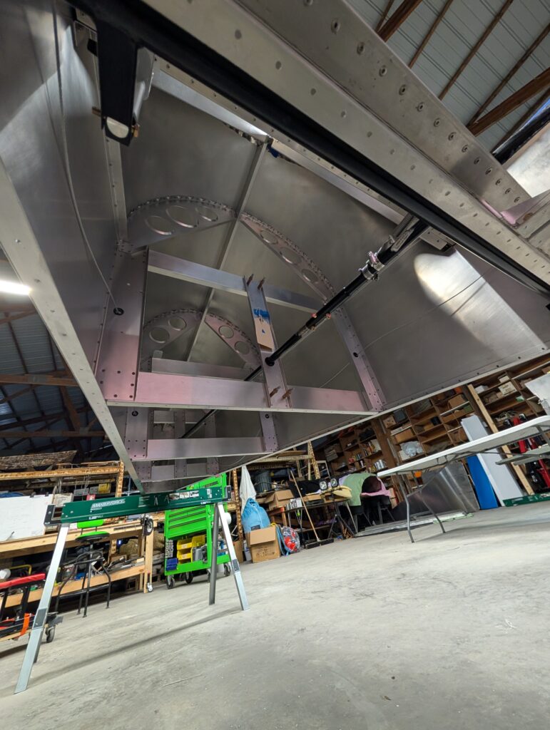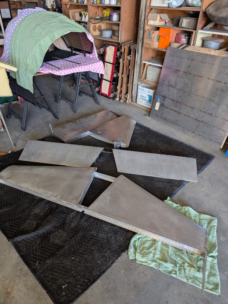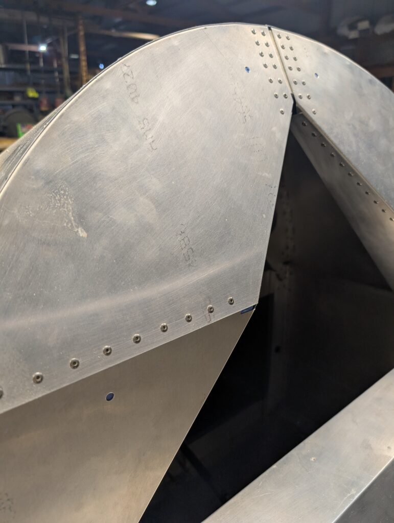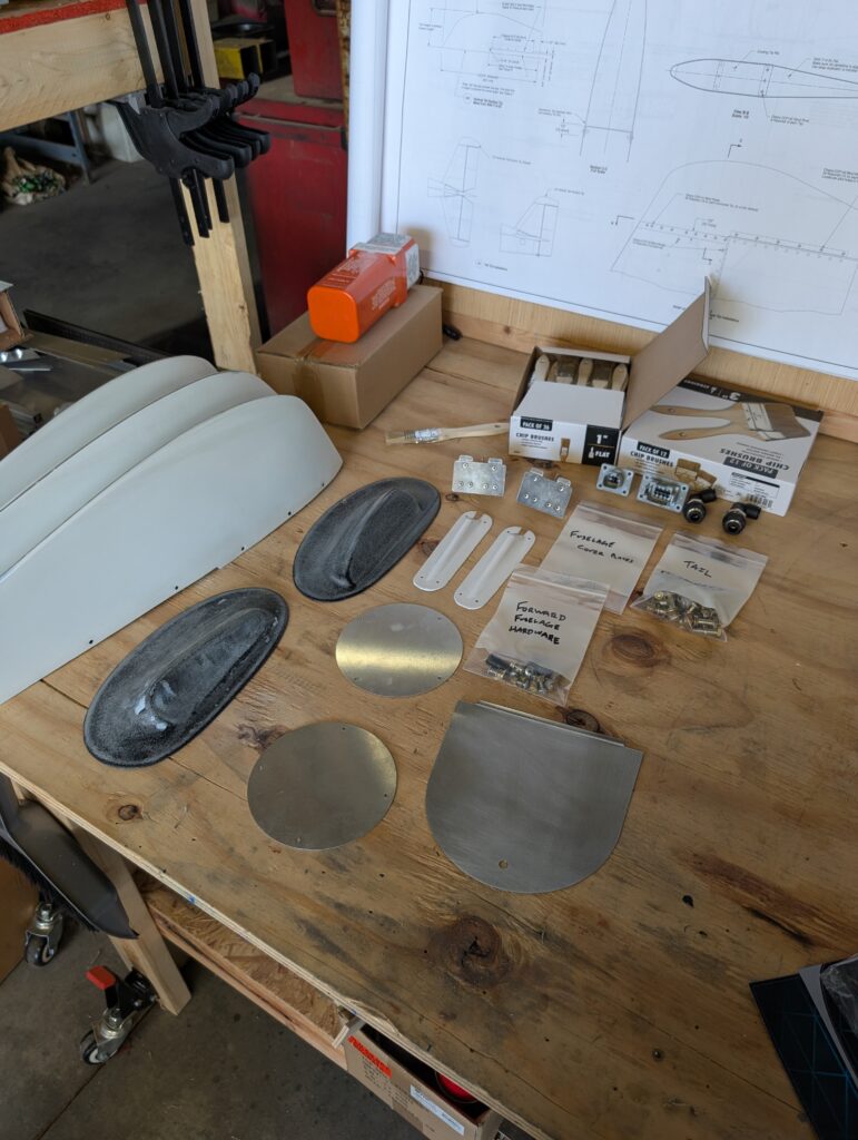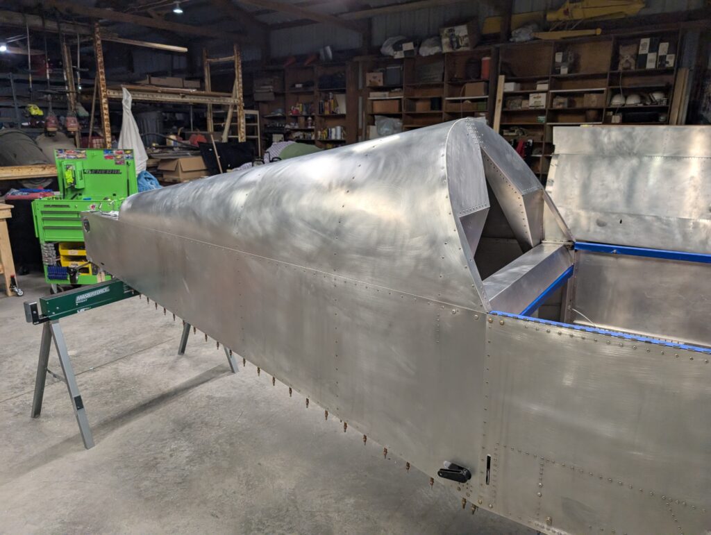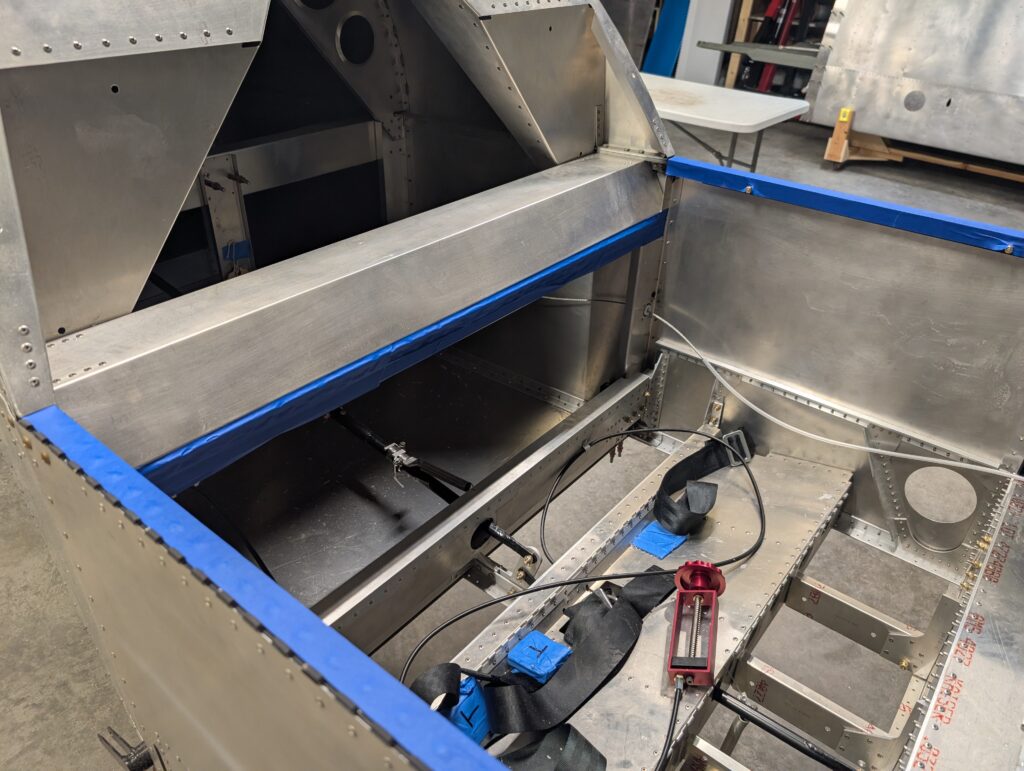 Began prepping fuselage for paint by removing tail components and setting off to the side. Removed inspection covers, pitot plumbing fittings, wing connectors, and vents from fuselage as well. Taped off edges of windshield with nice striping tape, then finished covering windshield with kraft paper and blue painters tape along with canopy sill on aft side of windshield bow. Taped off interior fuselage parts and removed aft fuselage floor for better access. Scotchbrited entire fuselage and cleaned with acetone. Began taping up openings in fuselage with painters tape.