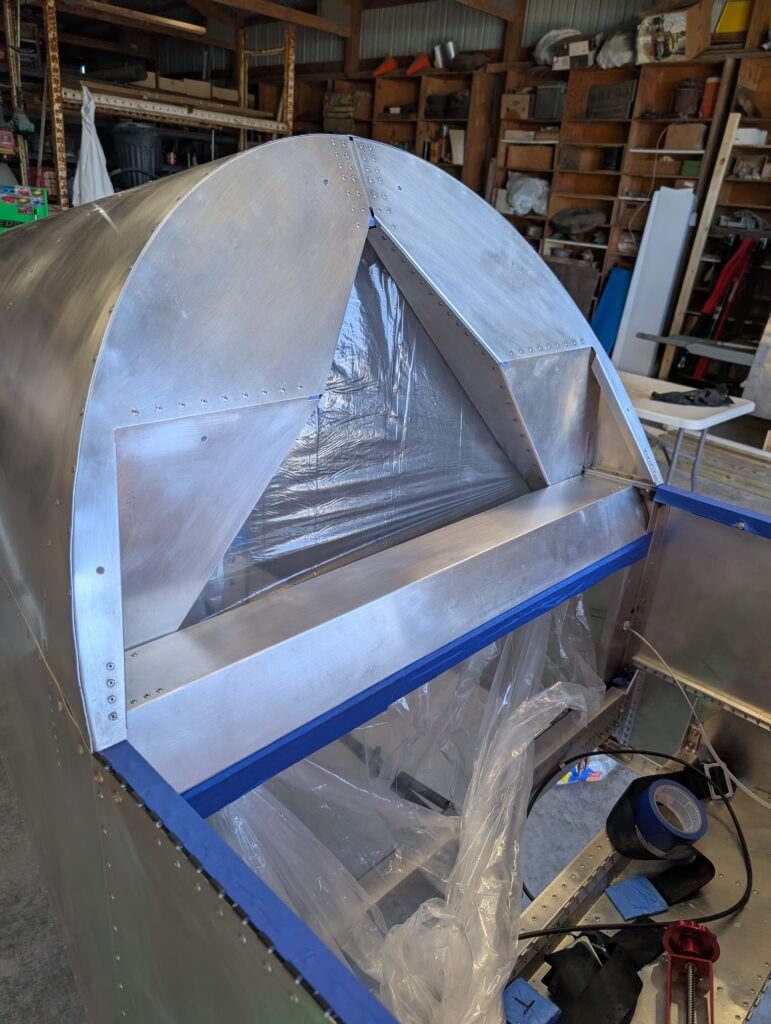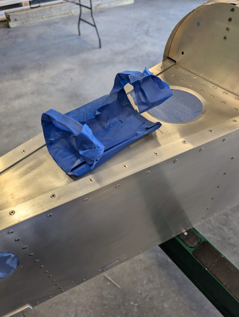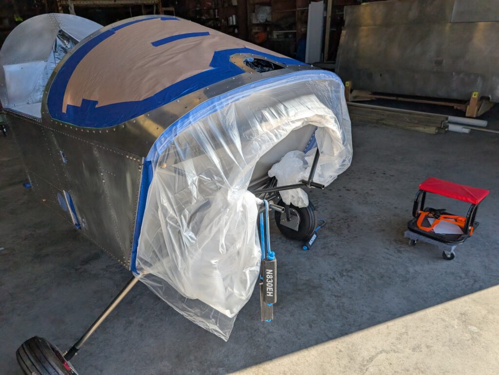 Finished prep of the fuselage for paint by masking off the ELT tray and straps, covering the baggage area with plastic, and masking off the seating area and firewall. Fuselage now completely masked and ready for paint.