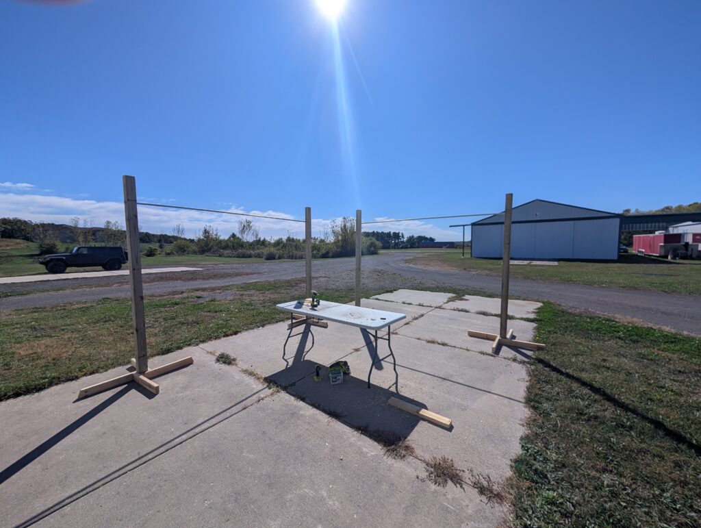 Built paint hangar stands for hanging control surfaces during painting out of scrap 2×4, 4×4, and 3/4″ EMT.