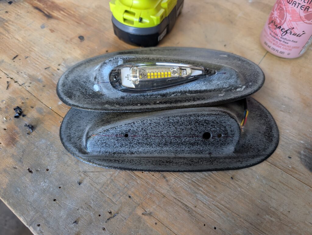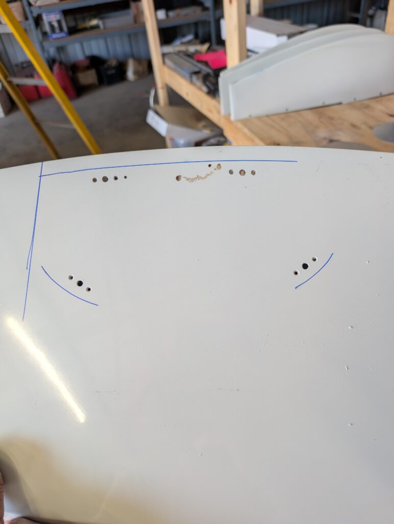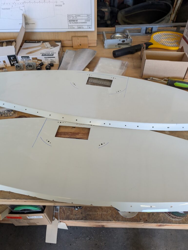 Began prepping wingtips and tip light fairings for paint and final finishing. Located tip lights onto wing tip light fairings and drilled wire pass through hole and mounting screw holes; tip lights will attach to fairing with Dynon panel screws and elastic nuts. Located tip light fairings on the wing tips by aligning center of light to the widest part of the wing (just aft of the main spar). Transferred mounting holes from the tip light fairings to the wing tips then drilled holes for nutplates. Cut large maintenance holes in wing tips where fairing will cover so that lights can be disconnected. Sanded outside edges of wing tips to prep for filler to be applied and deburred holes. Applied clear packing tape along outside edge of wing skins and reinstalled wing tips. Packed SuperFil into edges where there was a gap between the wing tip flange and the wing skin. Will remove and sand down wing tips in the future.