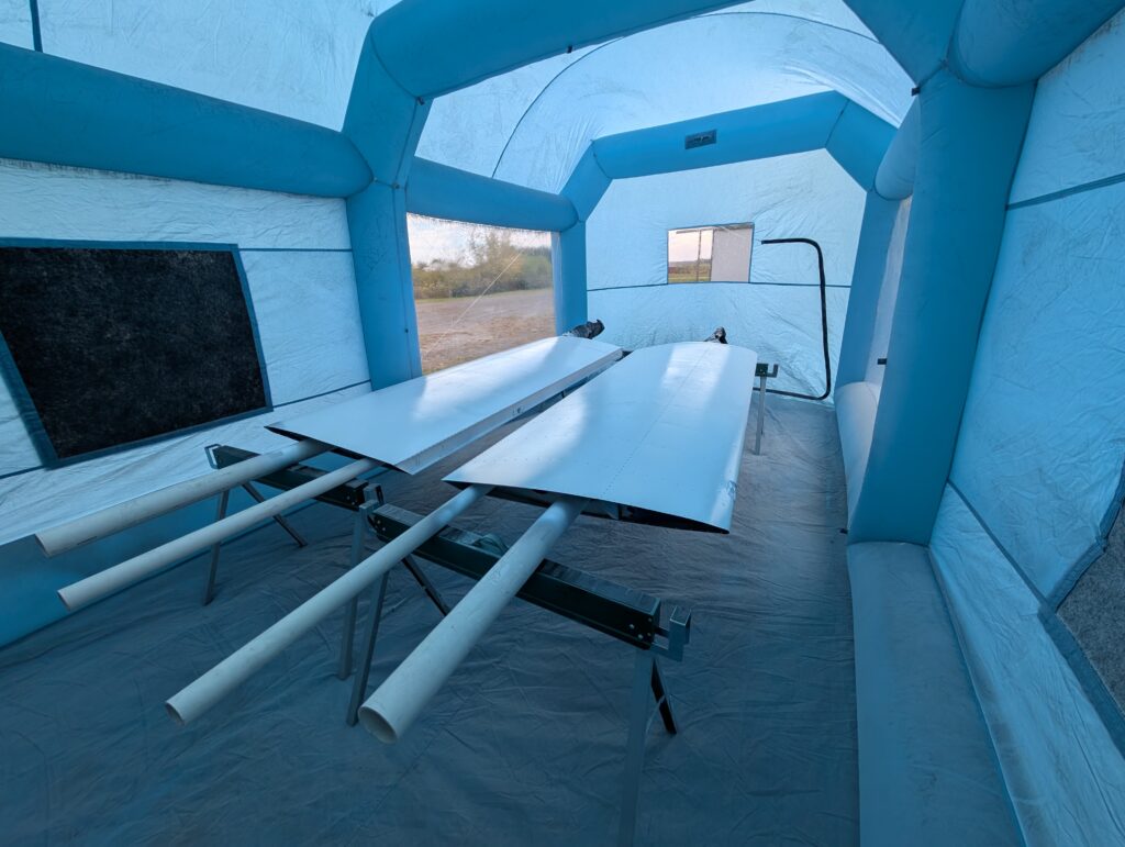 Setup paint booth and painted primer and white paint onto wings using same method as flaps and ailerons. Used 3″ PVC pipe and 2″ PVC pipe to support ends of wings by running it through the lightning holes.