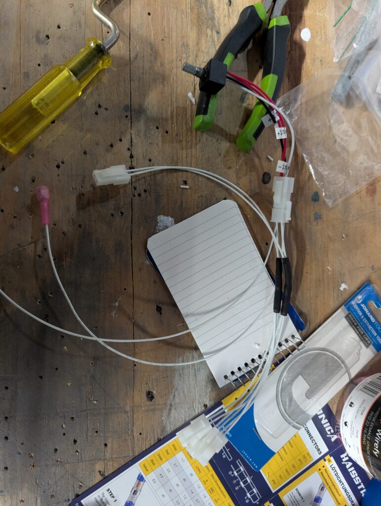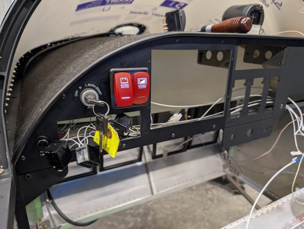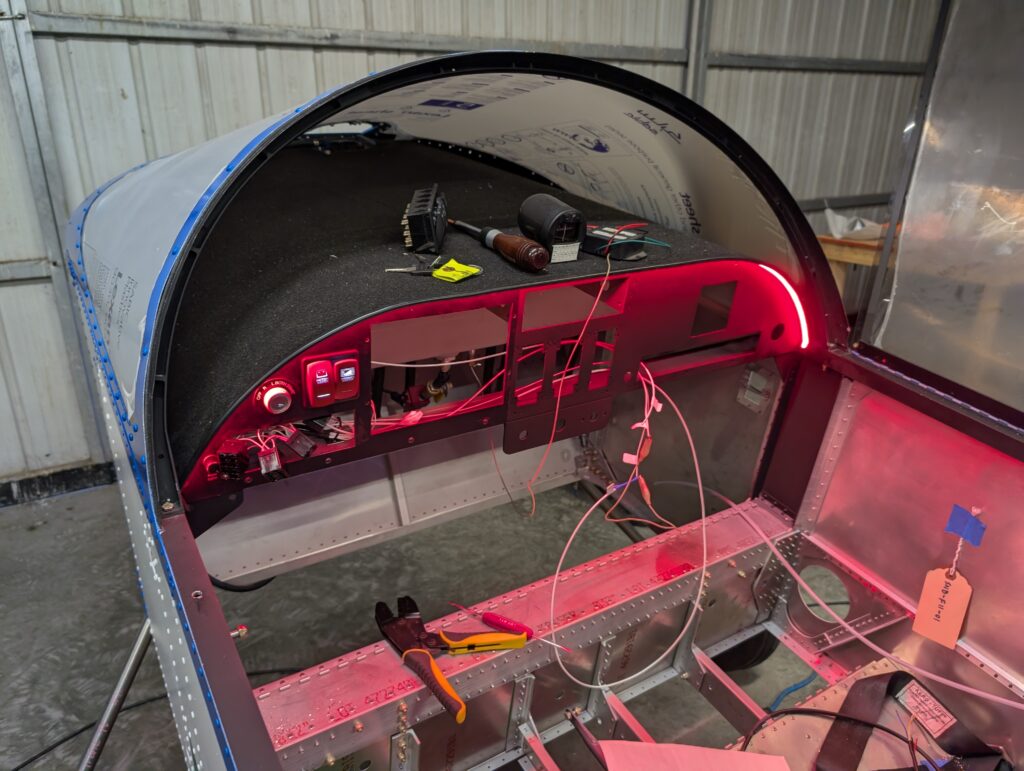 Fabricated panel lights harness for panel light dimmer using Molex connectors to save space behind panel. Opted to branch out individual harnesses for each device needed the dimmer switch rather than bundling components together. Made one extra panel light circuit in case the auto dimmers on the avionics aren’t effective. Installed dimmer switch into panel along with harness. Finished switch connectors for master switch and avionics switch, then installed switches into panel. Cleaned the underside of the glareshield with acetone, then cut LED panel light strip to size, stuck to underside of glareshield, installed Molex connector, and connected to dimmer switch. Installed Molex connector onto compass with solder sleeves and jumper wires since compass wires were too thin for terminals. Temporarily connected bus wires together to check operation of lights and master switch. Installed center panel cover.