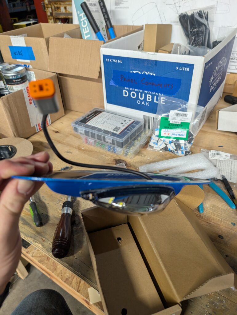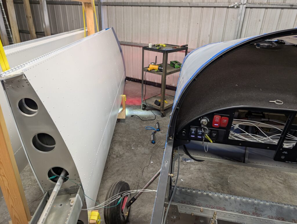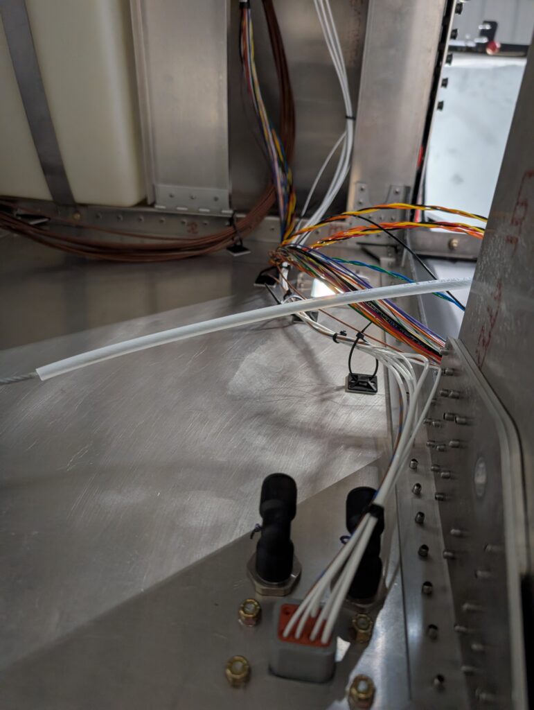 Attached wing tip lights to tip light fairings then installed DT connectors. Installed lights and fairings onto tips of wings. Terminated wing root wires at bulkhead connectors and tested functions. Reinstalled pneumatic bulkhead fittings for RH wing. Installed CHT/EGT harness and ran wires through firewall grommet. Installed engine sensor harness as well.