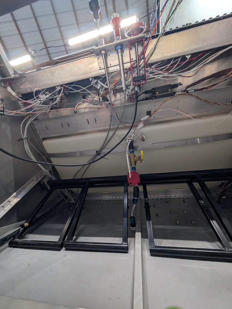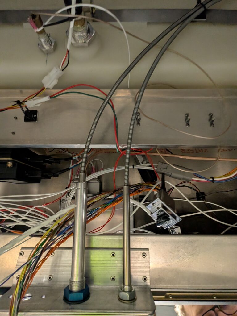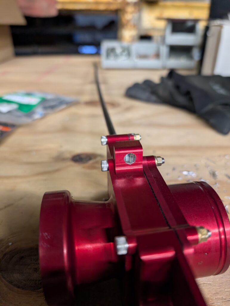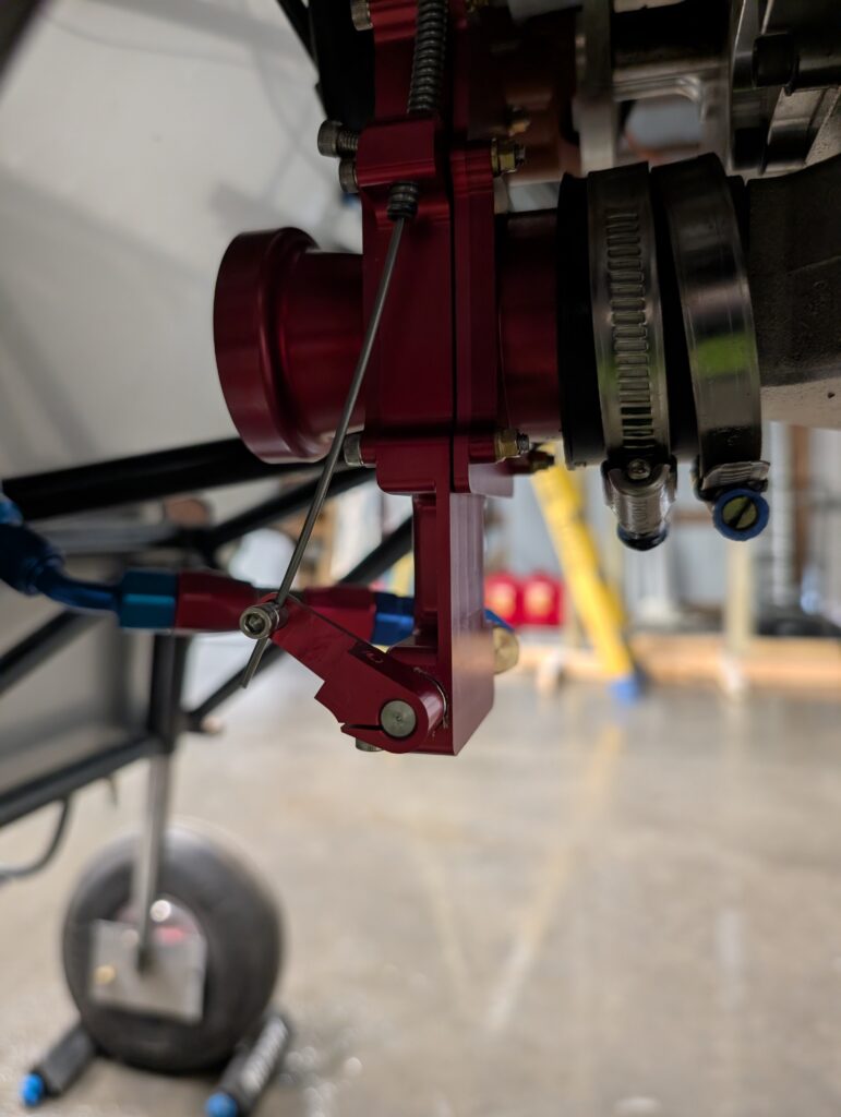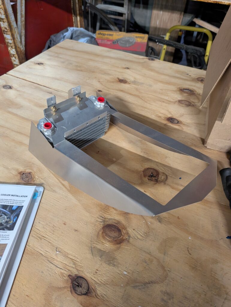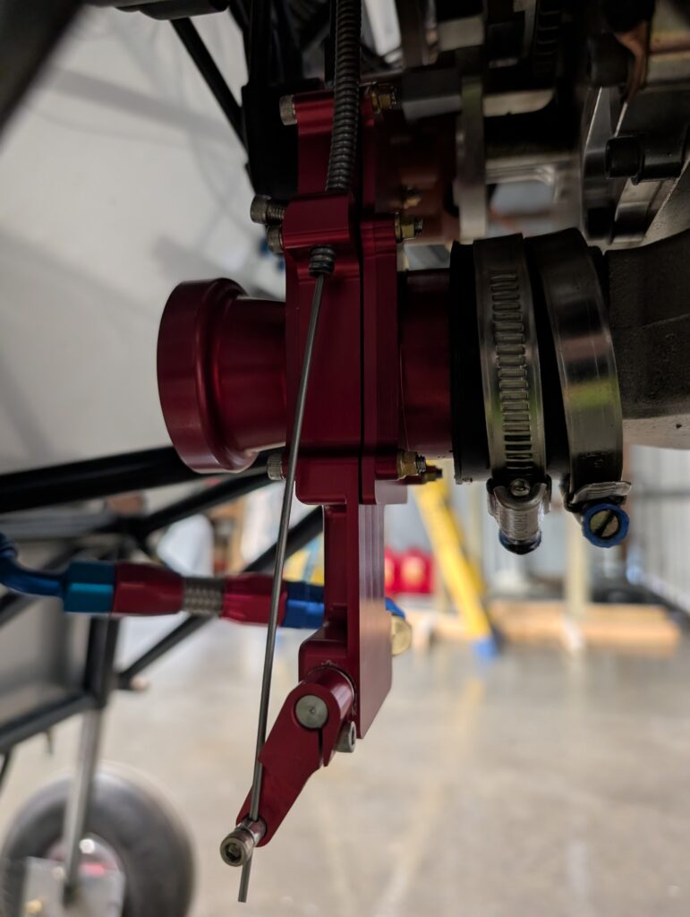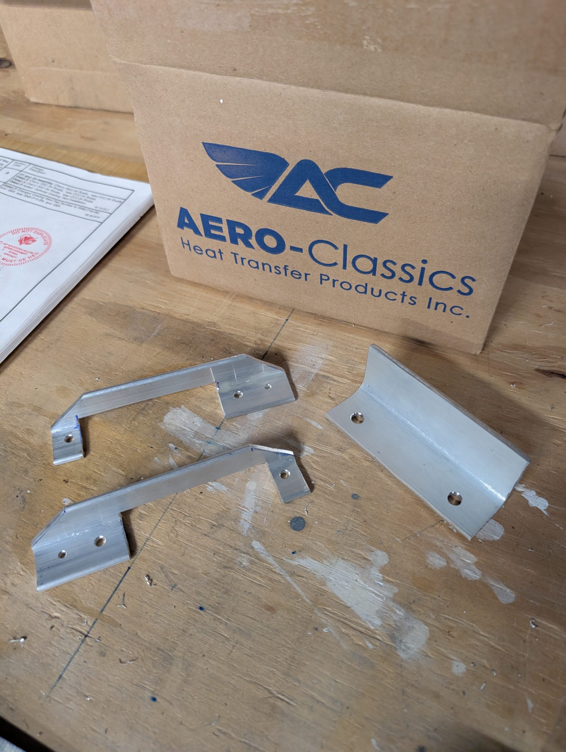 Installed mixture cable into center panel section and routed cable through previously installed cable safe. Measured out approximate length and removed inner cable from jacket (making sure to carefully catch ball in cable mechanism). Trimmed outer jacket then upsized cable hole in AeroInjector to 1/4″. Installed AeroInjector back onto back side of motor and ran throttle and mixture cables back. Trimmed mixture cable to generate 90 degrees of rotation on the fuel lever per the manual. Ops checked both controls. Installed trim knob onto center section of panel; will secure trim cable once side panels are in place. Continued working on engine install checklist by removing the front lower flange of the oil cooler to clear the cowling. Made oil cooler mounts out of aluminum angle and bolted to the back of the oil cooler. Secured oil cooler baffle to top mount screws.