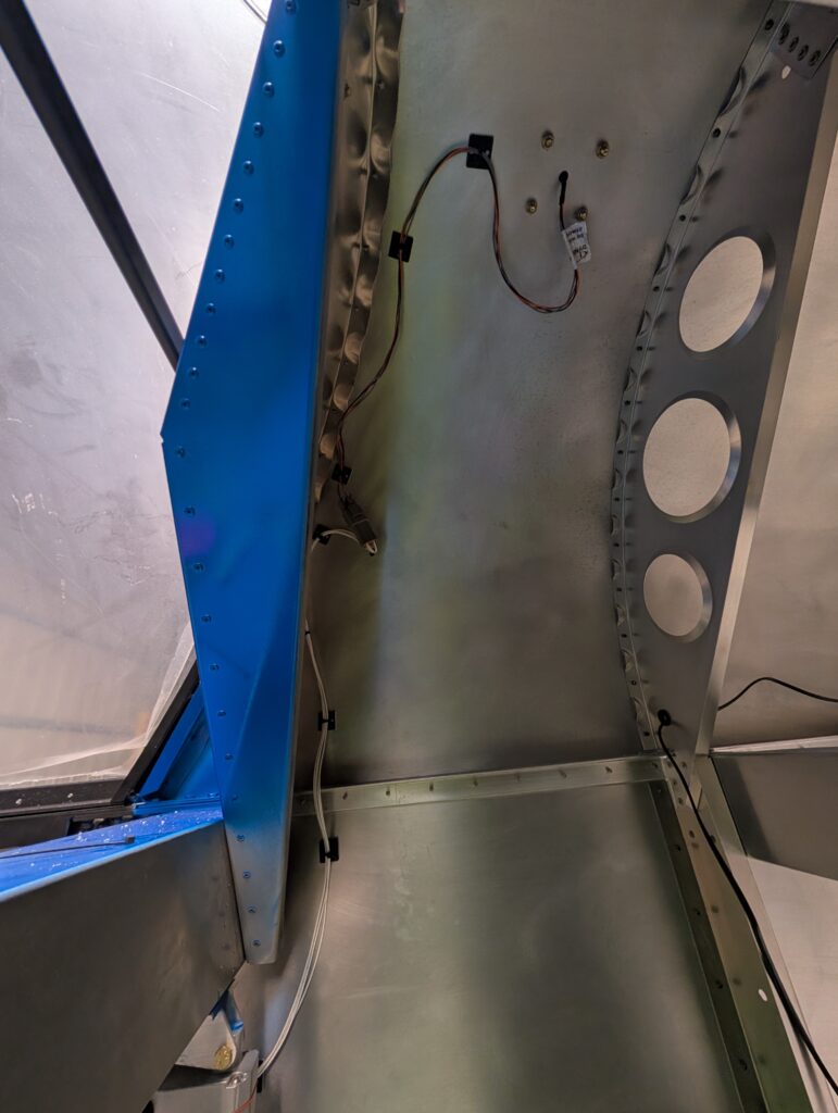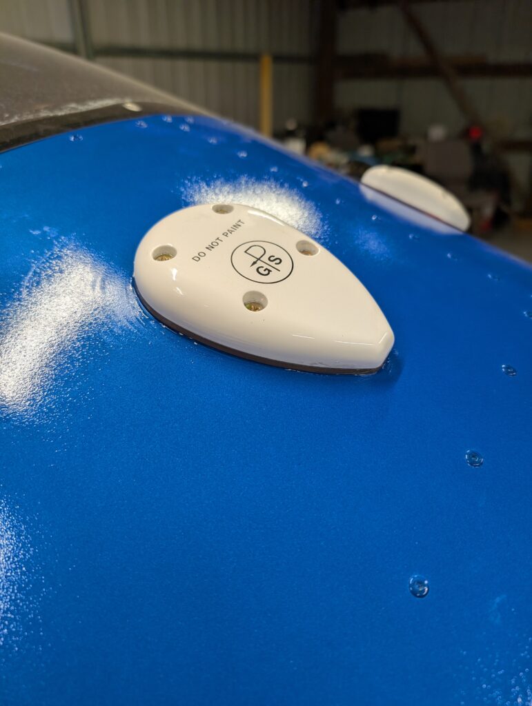 Drilled mounting holes for both GPS units on top of turtle deck and installed antennas using MS24693 screws. Applied clear silicone sealant around edges of GA 35 antenna to prevent water intrusion into baggage compartment; did not use sealant under Dynon antenna because a gasket was included. Secured wiring for SV-GPS-250 antenna.