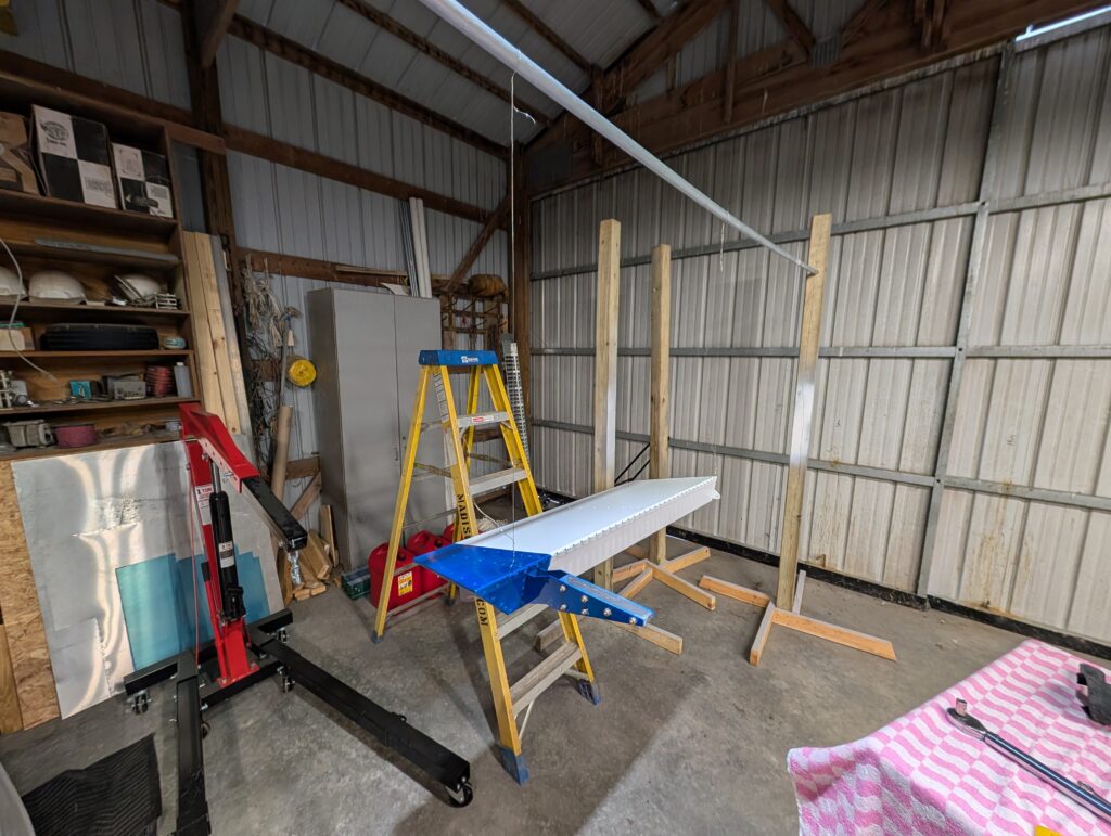 Assembled paint fixture to hang ailerons from. Suspended RH aileron from fixture and bolted lead counterweight onto bracket. Checked levelness per plans and did not need to remove any material. Repeated process for LH aileron and drilled one 3/16″ hole on top of lead counter weight approximately 1/2″ deep to achieve balance. Ailerons now complete and ready to be mounted.