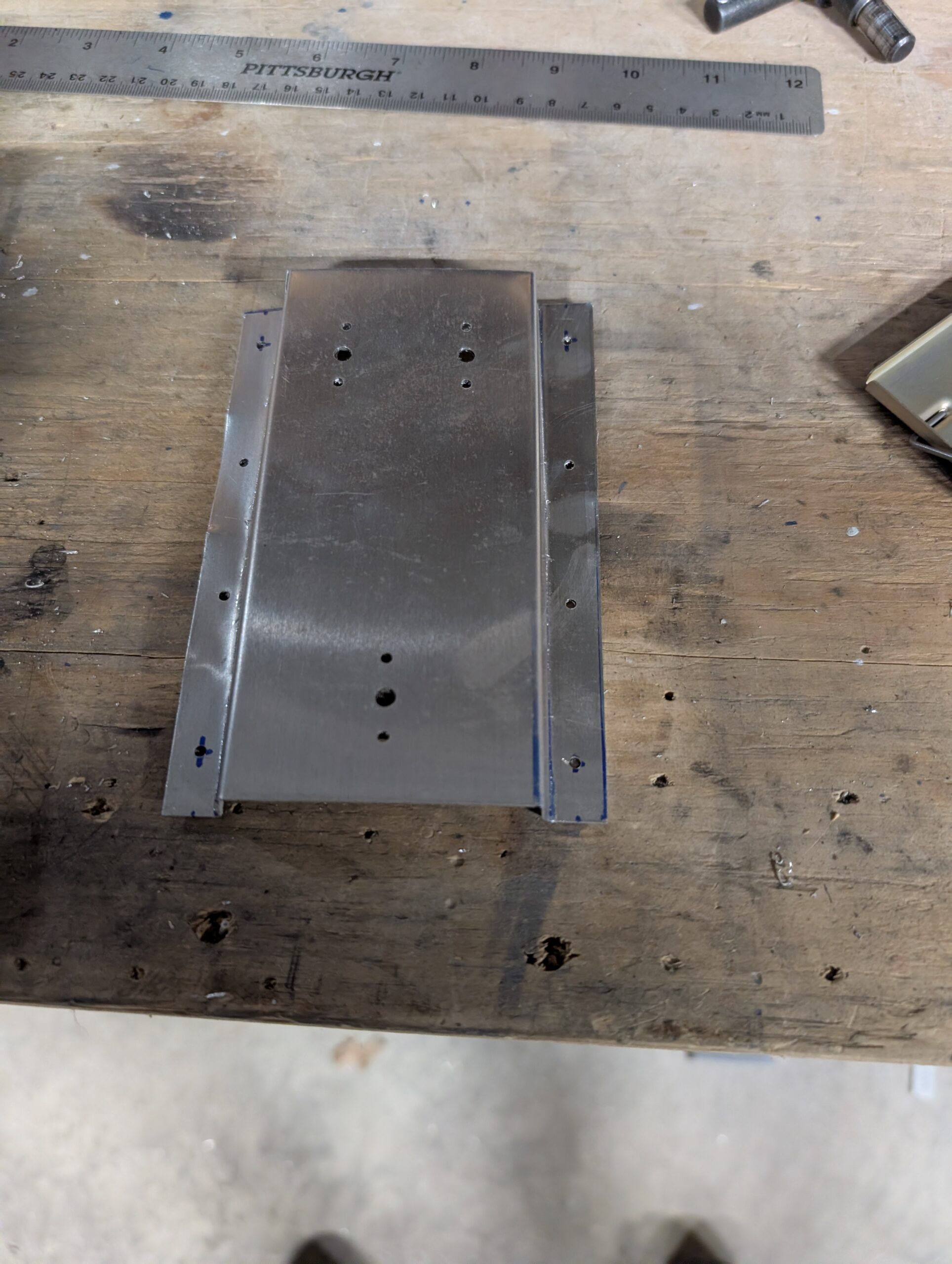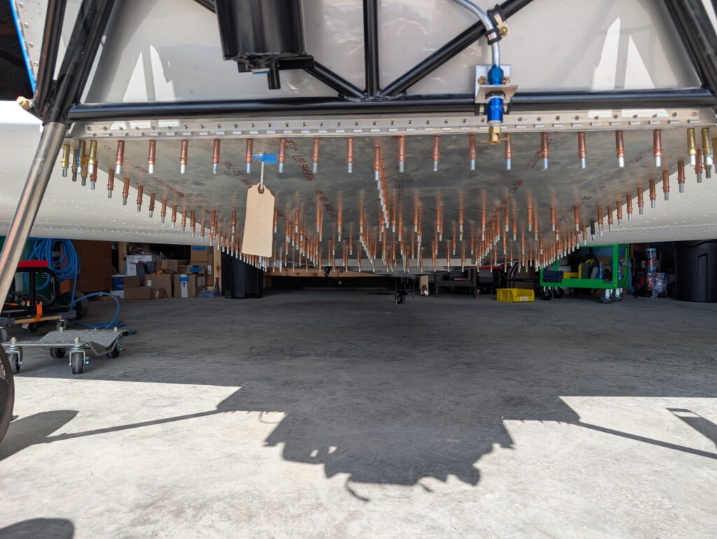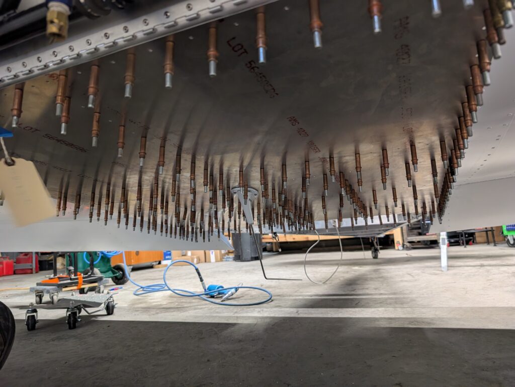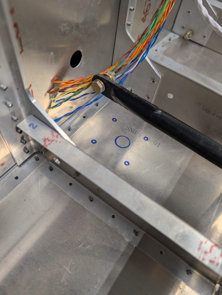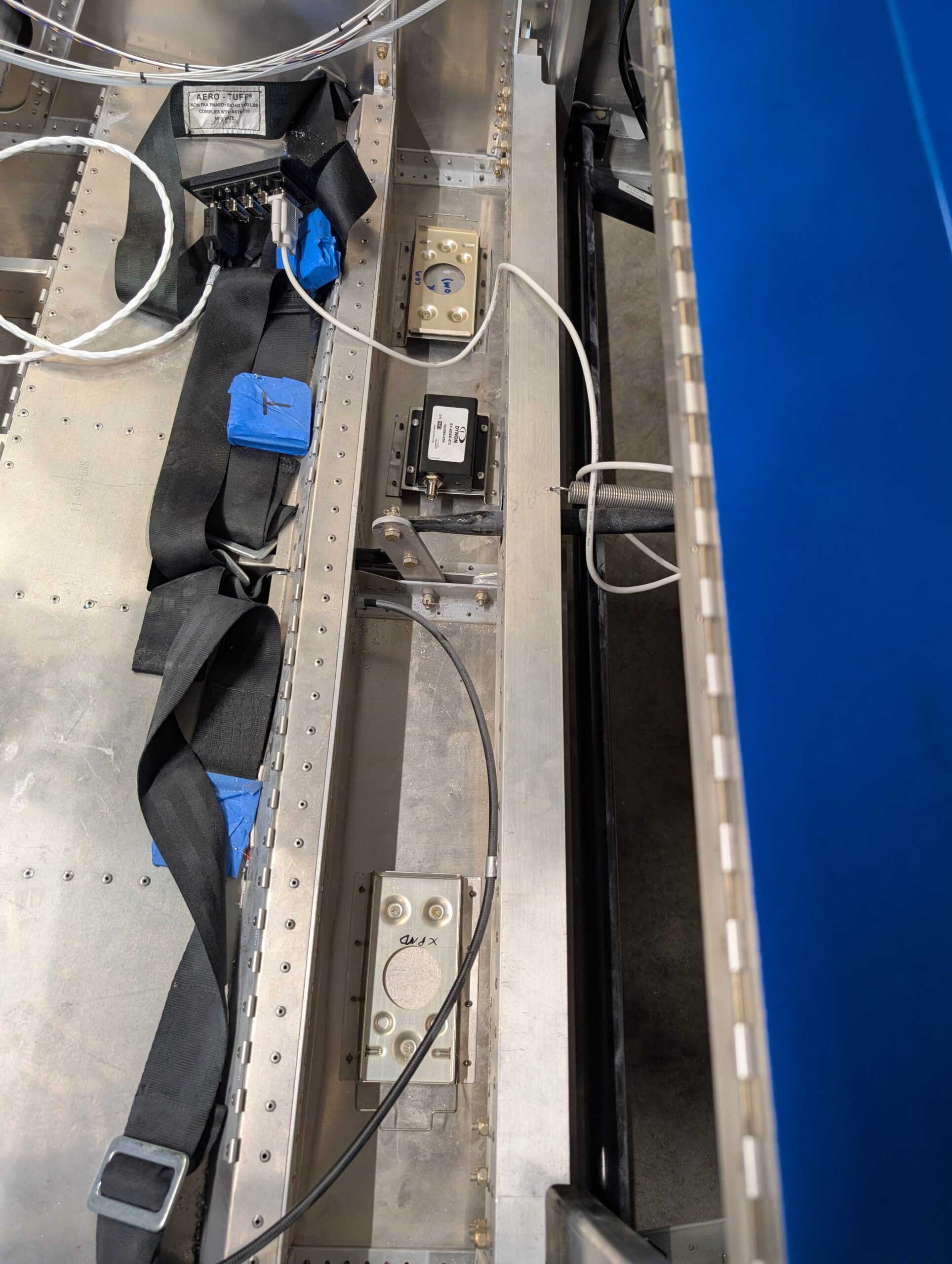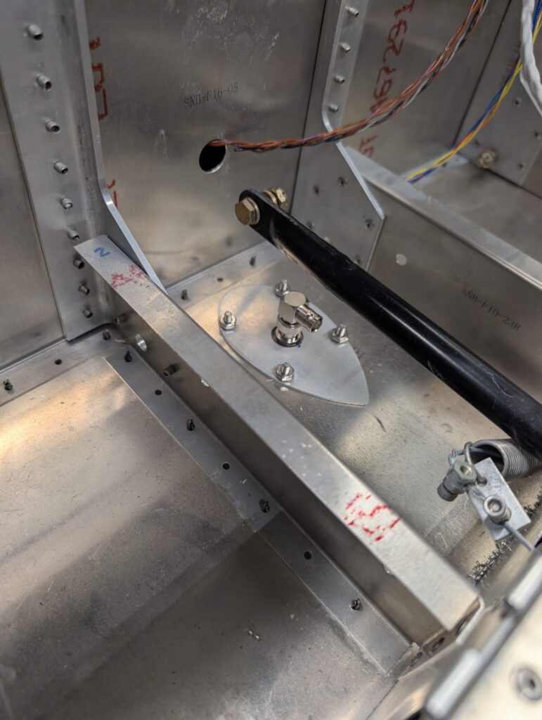 Clecoed forward fuselage floor back onto fuselage to start under seat component layout. Made riser mounts for ADSB, transponder, and com boxes so that nutplates could be used out of scrap aluminum. Riveted mounts to fuselage floor behind seat pan and bolted SV-COM-T25, SV-ADSB-472, and SV-XPNDR-261 units into place. Drilled holes for transponder and ADS-B antennas in back corners of forward floor and installed antennas into place. Located com antenna directly behind spar tunnel on fuselage centerline and checked for clearance with elevator pushrod. Drilled mounting holes per Rami template then bolted COM antenna into place.