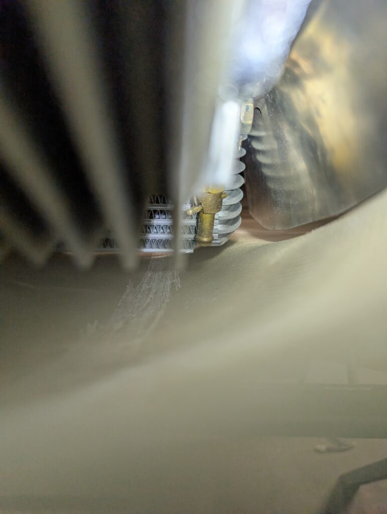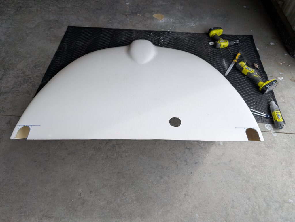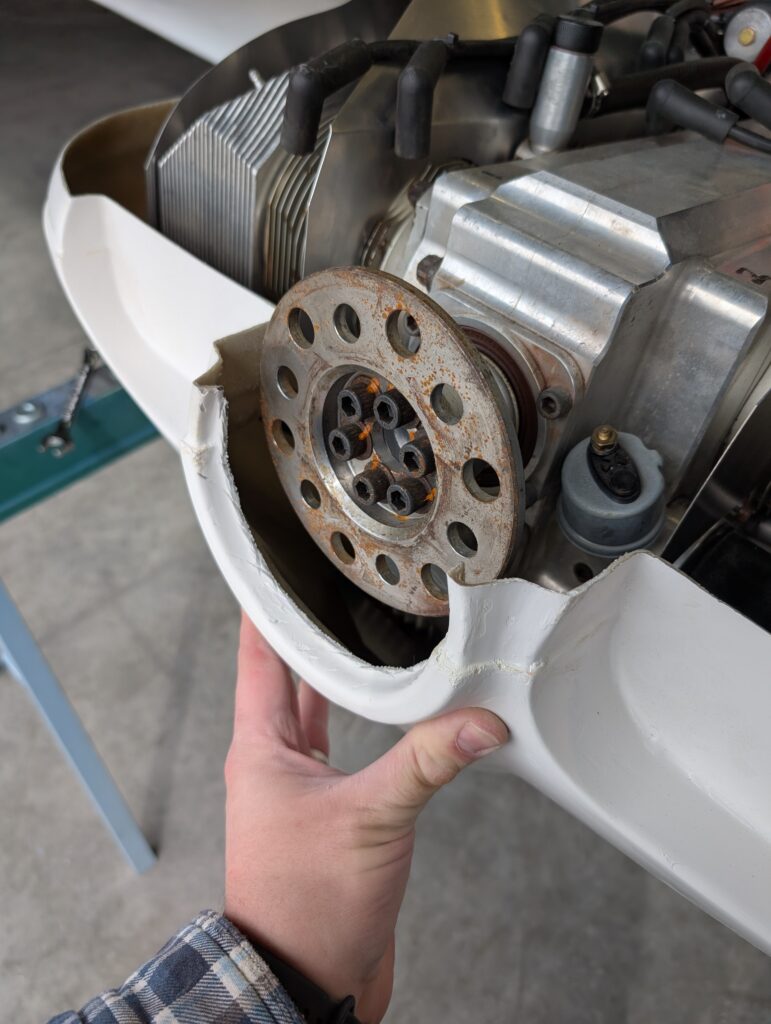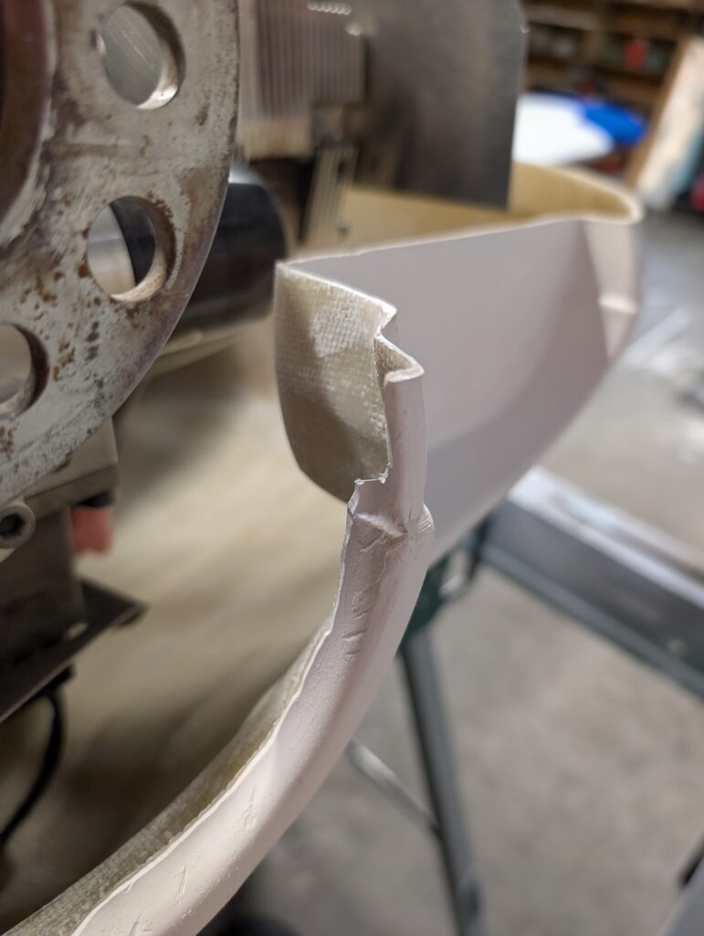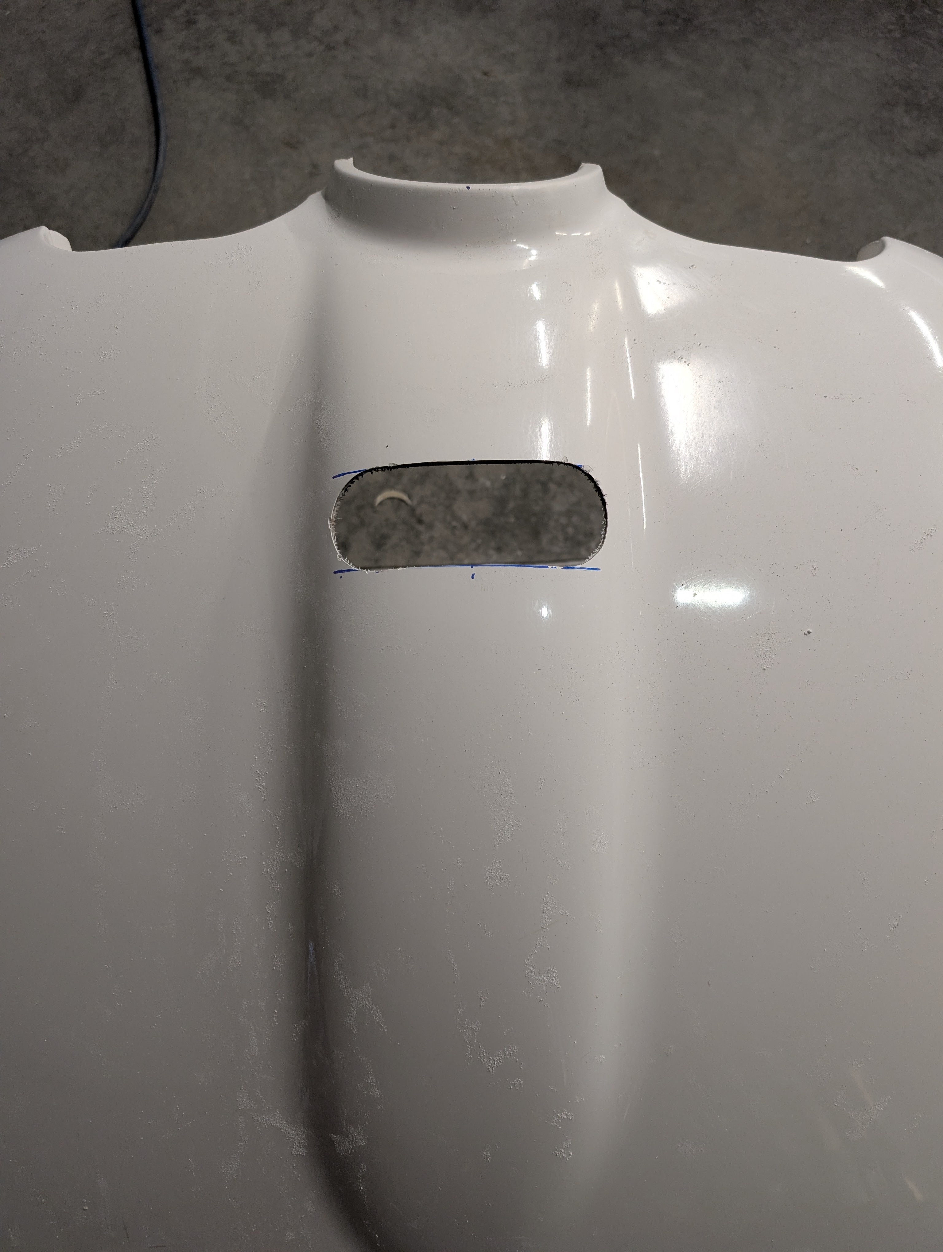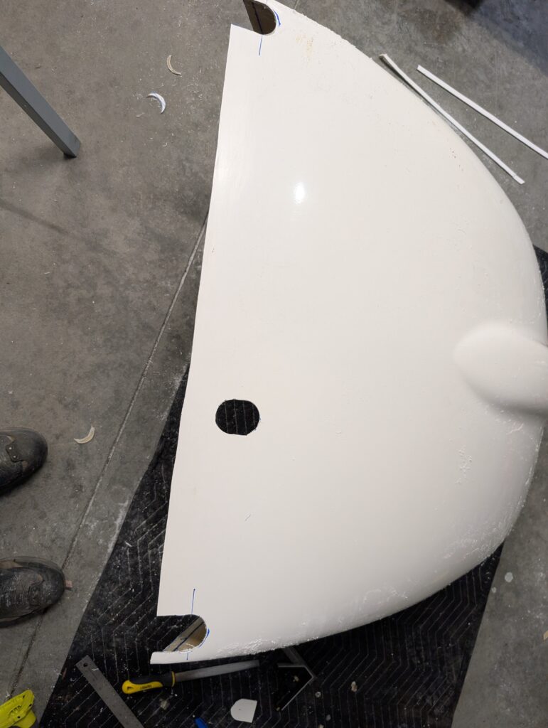 Began fitment of lower cowl by marking out locations for gear legs and fuel drain. Slid lower cowl into place and measured front face of cowl offset by approximately 1″. Trimmed back edges of cowl 1/2″ at a time while moving cutouts forward at the same time. Refit cowl and determined that proper forward alignment is being prevented by forward bottom edges of the oil cooler impacting the cowl. Made cut out on front of cowl for oil cooler to get better look at engine interference. Will need to solve interference issue before continuing to fit lower half of cowl.