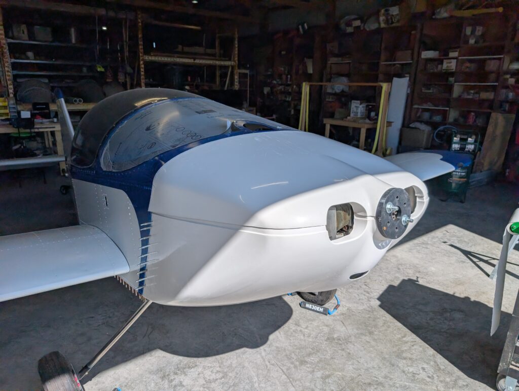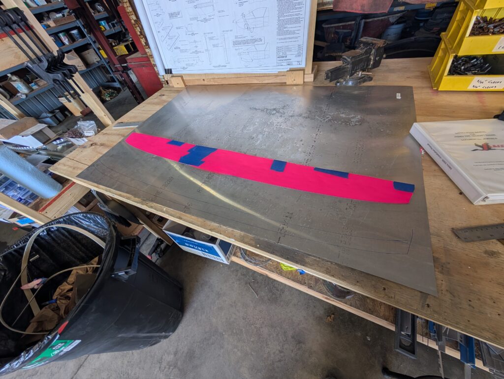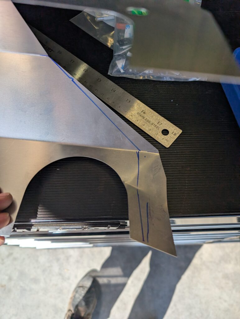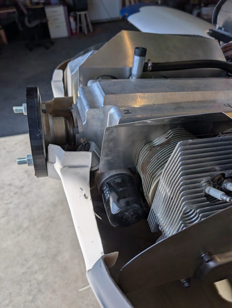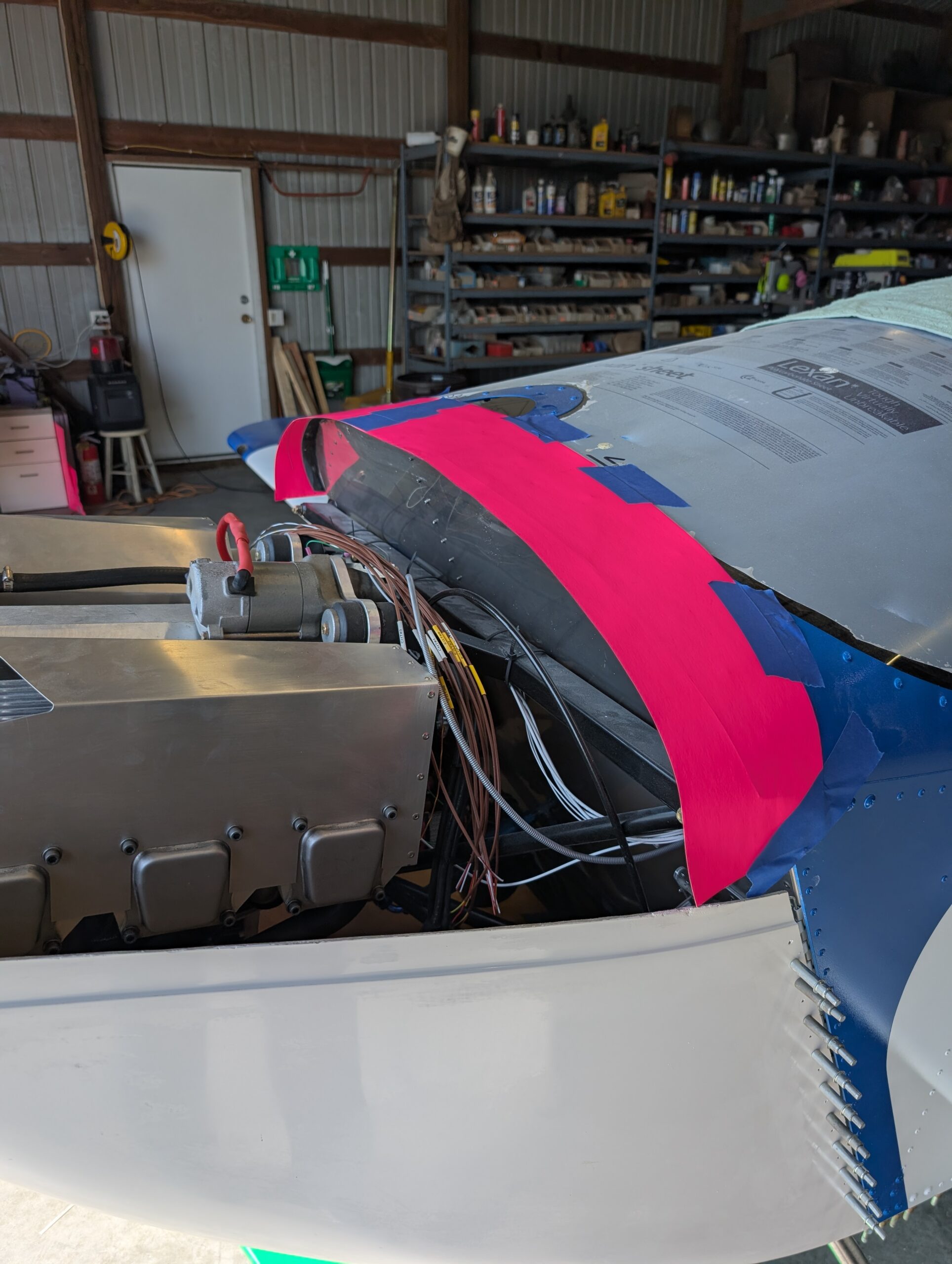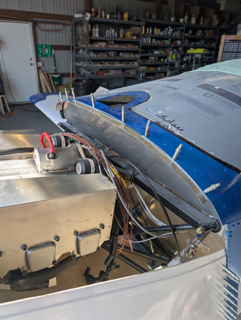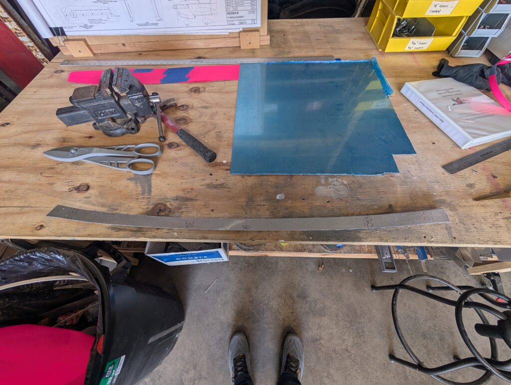 Began fitting upper cowl by placing onto lower cowl and notating baffling interference. Trimmed front of baffles by about half an inch and rechecked clearances. Made the determination that tucking upper cowl under the windshield skirt will likely make removing the upper cowl difficult with prop in place. Began process of making a shelf for the upper cowl to sit on by tracing the curvature of the windshield skirt on poster board. Used paper template to cut cowl mount shelf out of 0.025 aluminum sheet. In order to have the cowl sit flush with the skirt, made spacers to sit between shelf and windshield skirt out of 0.063″ strips. Clamped assembly together then pilot drilled and clecoed shelf into place. Went back and forth a couple of times trimming the upper cowl and re-trying fitment. Will still need more trimming before final fitment and drilling attach screws. Prop opening area still needs trimming as well.